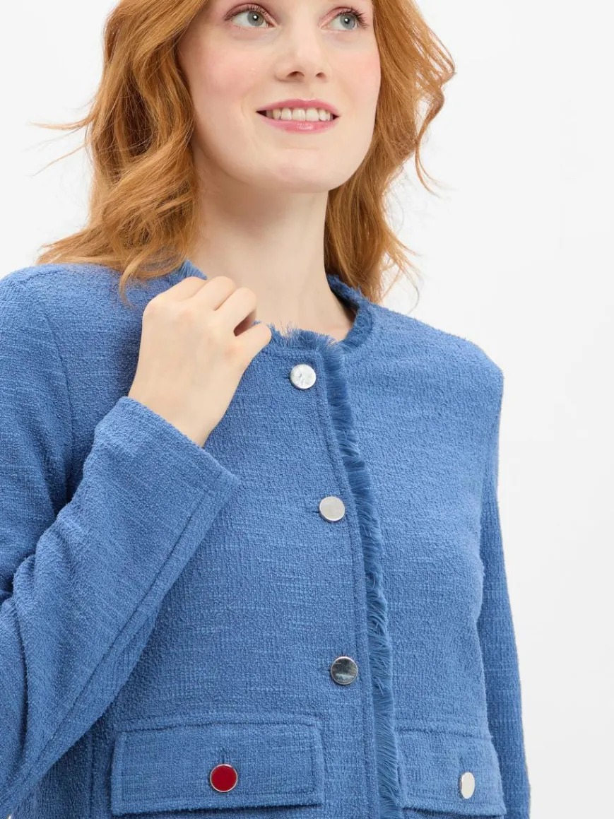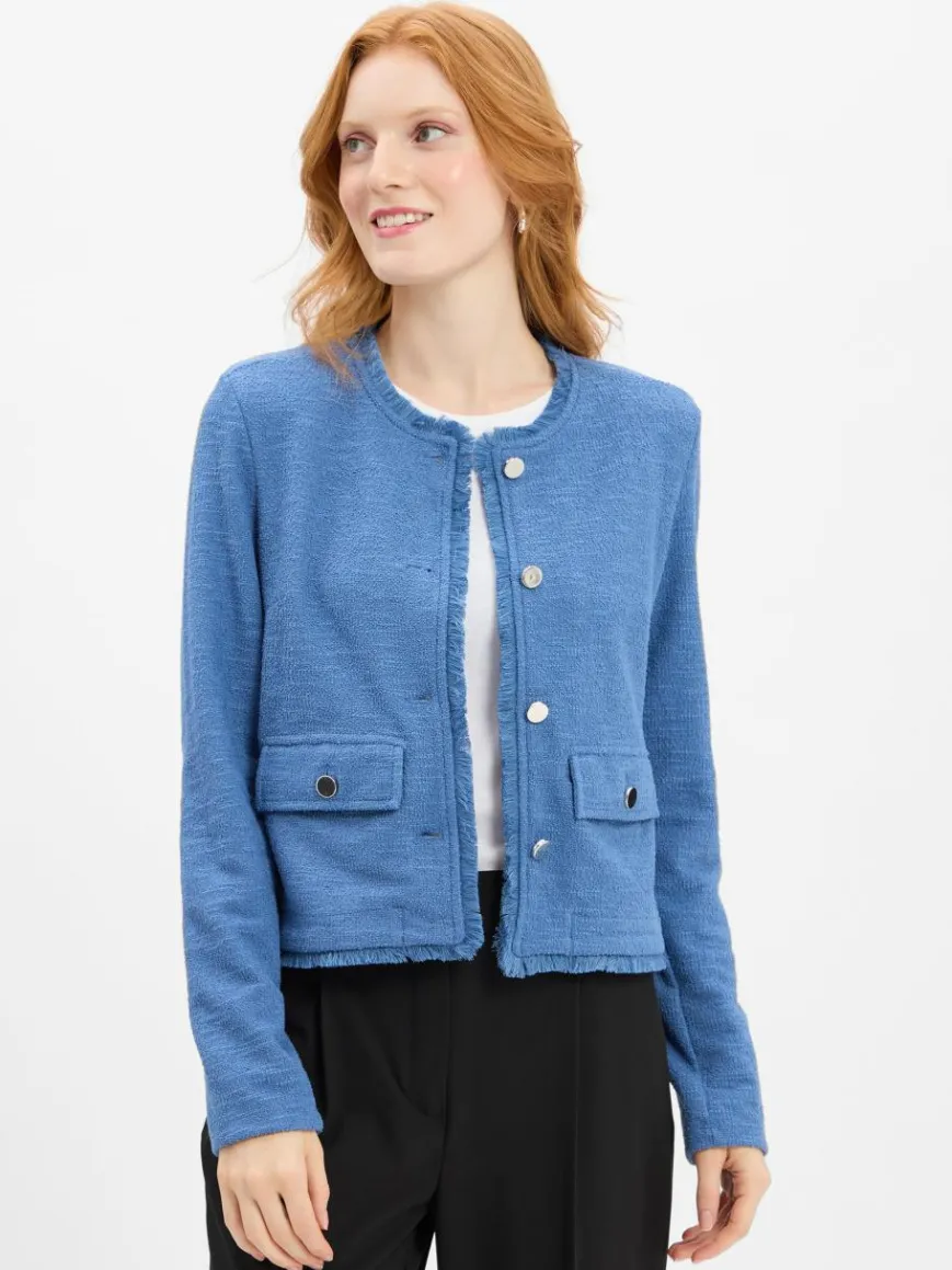 Im klassisch-eleganten Look überzeugt die Blazer-Jacke von More & More mit stilvollen Pattentaschen und feinen Fransen als zeitloses Schmuckstück für die Garderobe.