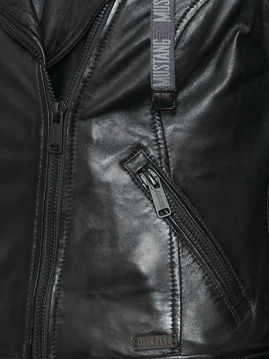 Coole Lederjacke der Trendmarke Mustang. Die Bikerjacke wird mit einem Knopfverschluss geschlossen und verfügt über coole optische Details. Sie besitzt außerdem eine Innentasche und zwei Außentaschen die für ausreichend Stauraum sorgen.