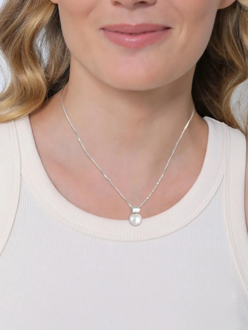 Eleganter Perlenanhänger aus feinstem 925er Sterling Silber mit einer hochwertigen synthetischen Perle. Diese wunderschön schlichte Kristalle Perle 12mm rund, verleiht dem Anhänger eine Einzigartigkeit. Ein Accessoire, welches in keiner Schmucksammlung fehlen sollte. Die Halskette dient lediglich zur Veranschaulichung und gehört nicht zum Lieferumfang.