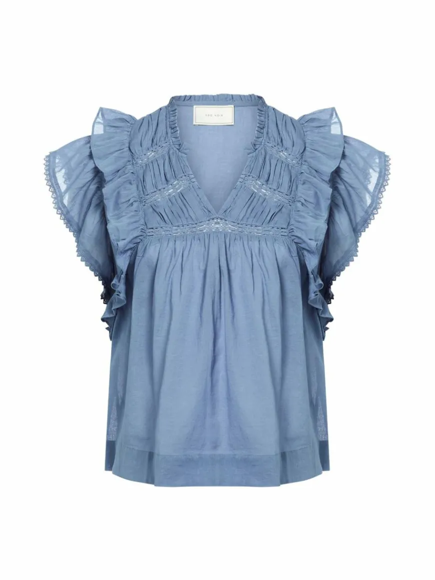 Das Neo Noir Jayla Blusentop aus leichter Baumwolle verleiht durch zarte Rüschen- und Spitzendetails einen romantischen Touch.