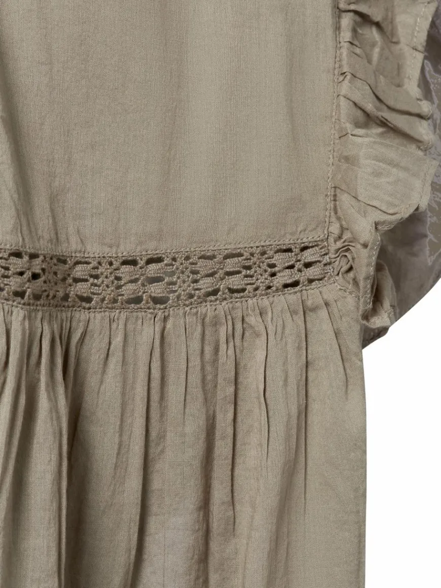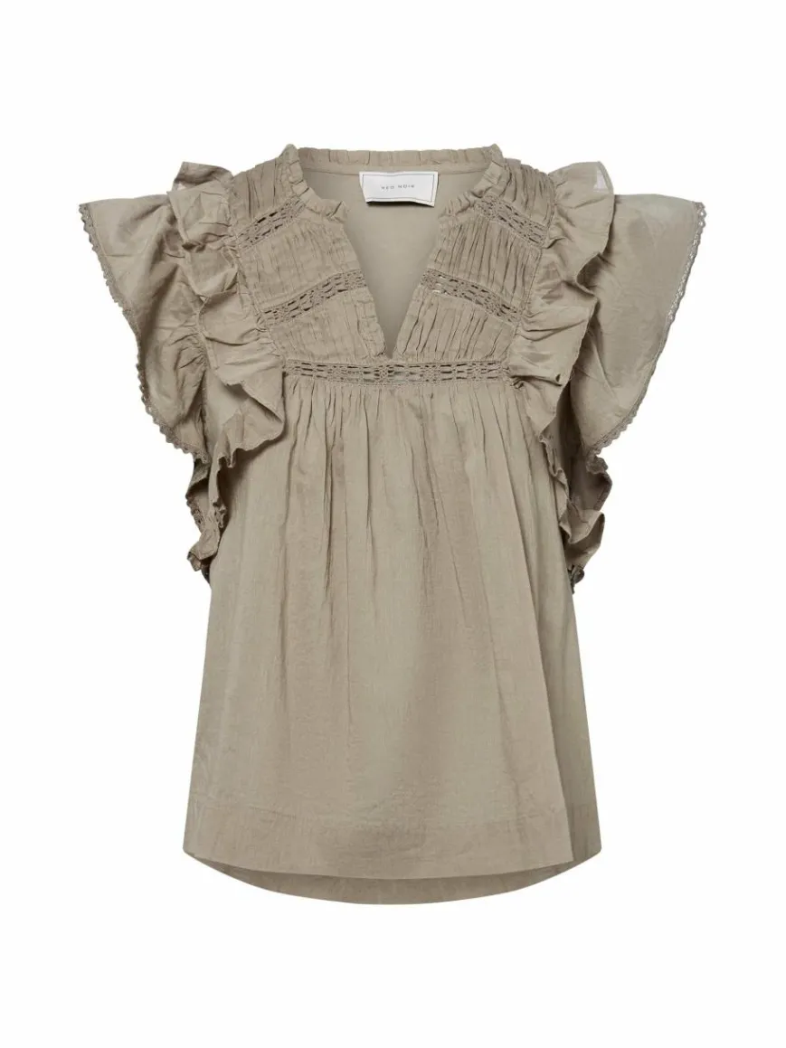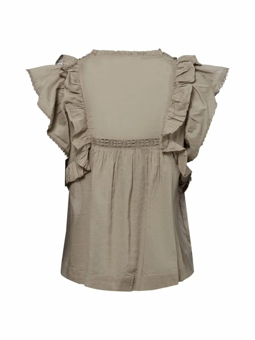 Das Neo Noir Jayla Blusentop aus leichter Baumwolle verleiht durch zarte Rüschen- und Spitzendetails einen romantischen Touch.