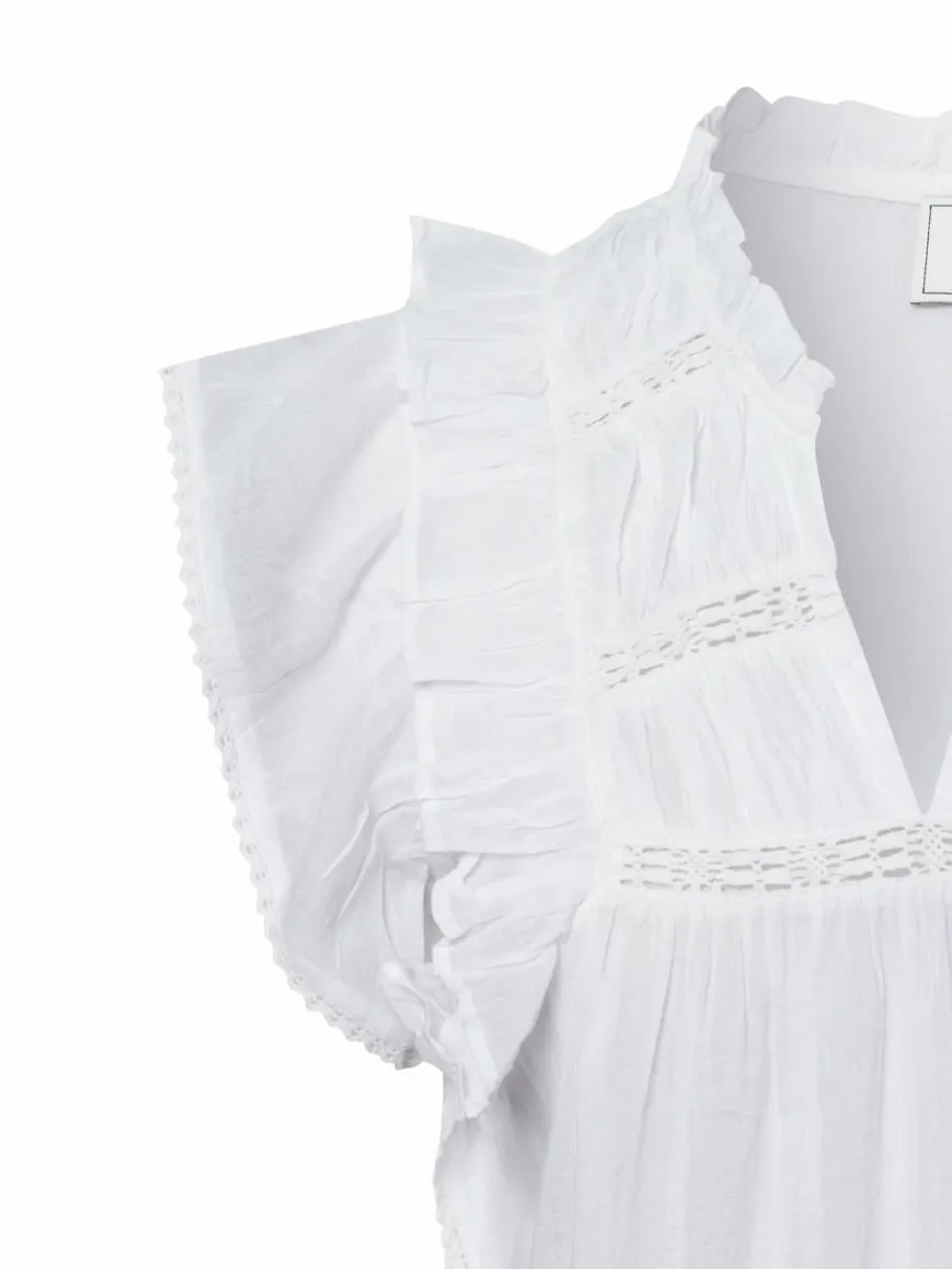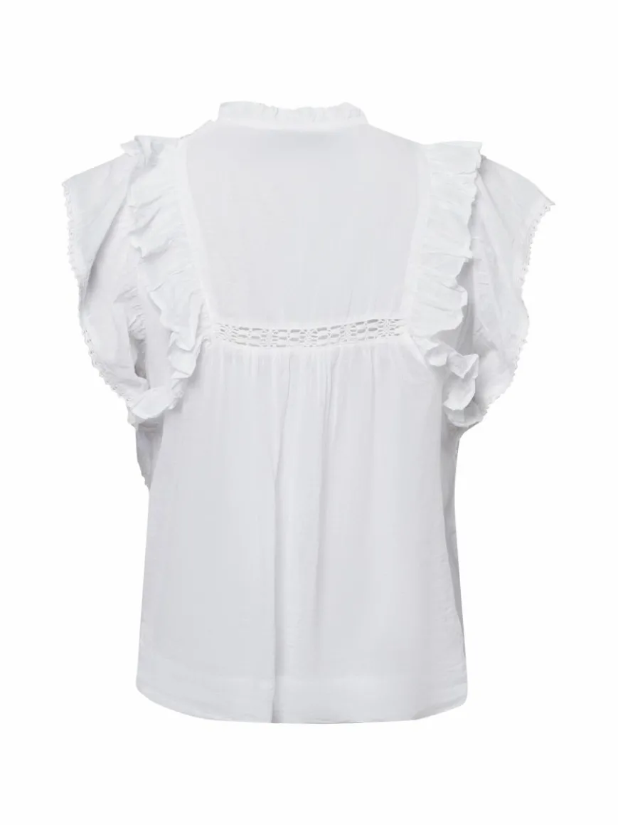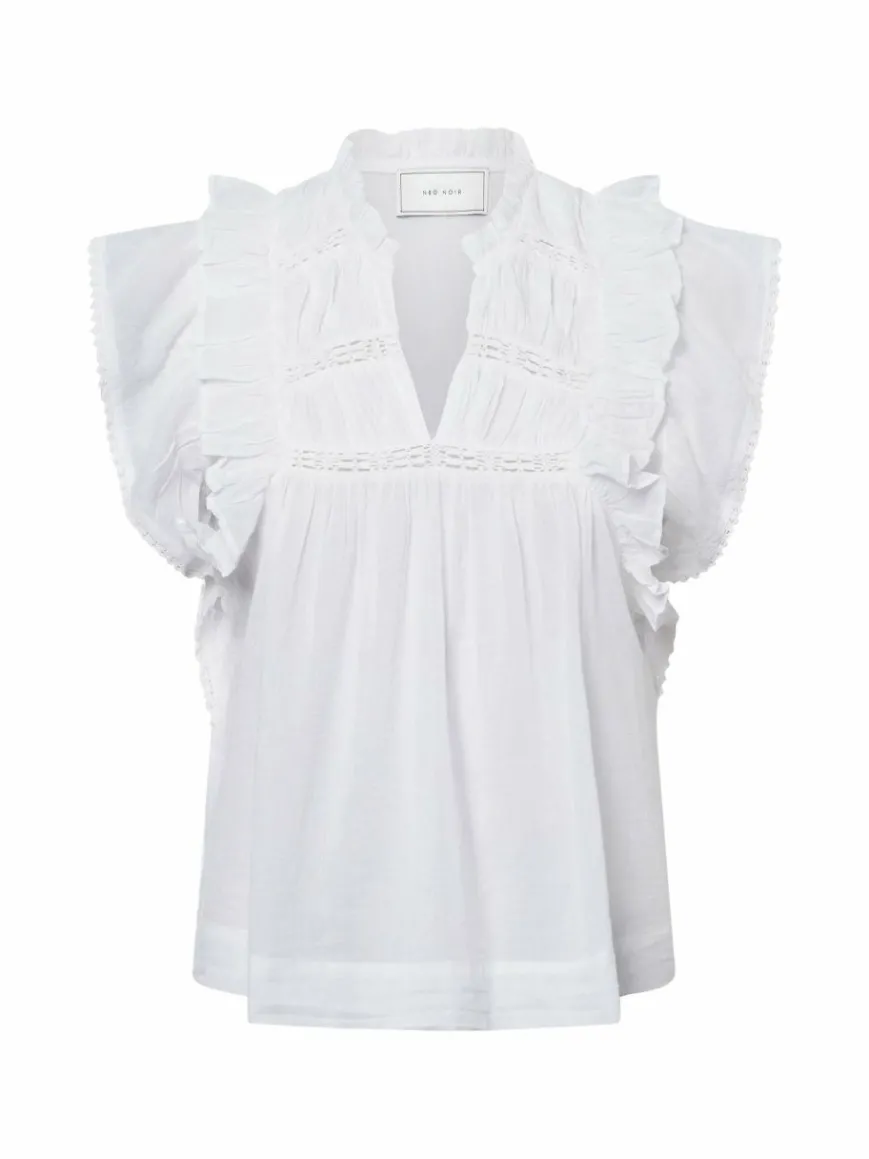 Das Neo Noir Jayla Blusentop aus leichter Baumwolle verleiht durch zarte Rüschen- und Spitzendetails einen romantischen Touch.