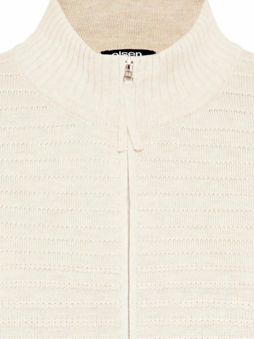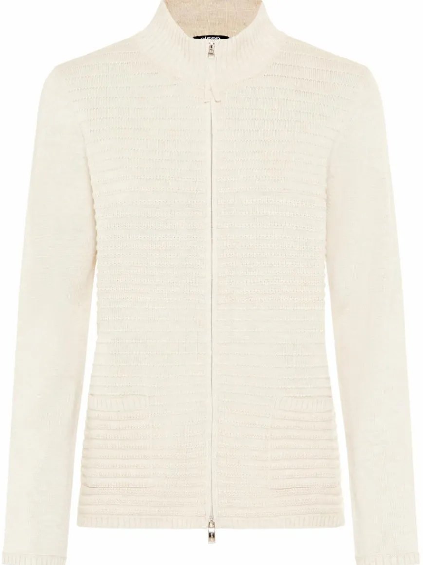Die Strickjacke Eva von Olsen mit haptischer Rippstruktur an der Vorderseite und praktischem Two-Way-Zipper verleiht dem Look nonchalant eine casual-sportive Note.
