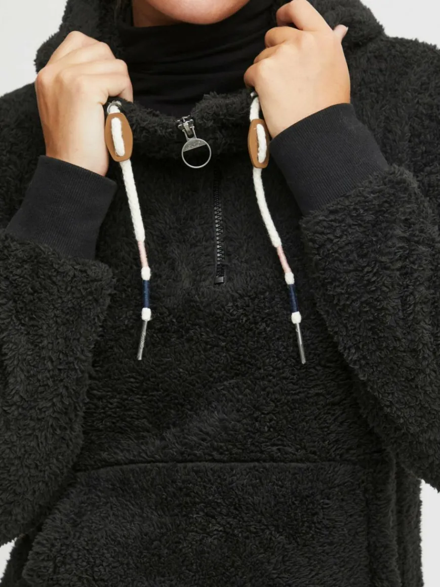 Dieser Kapuzenpullover aus Teddy bietet Damen eine gelungene Kombination aus Wärme, Komfort und stilvollem Design. Die hochwertige Qualität und Verarbeitung sorgen für ein angenehmes Tragegefühl und zuverlässigen Sitz. Kombinierbar mit Joggpants, Jeans, Cargohosen oder einer Stoffhose ergänzt durch Parka oder Übergangsjacke. Ein gemütliches Basic für entspannte und modische Outfits.
