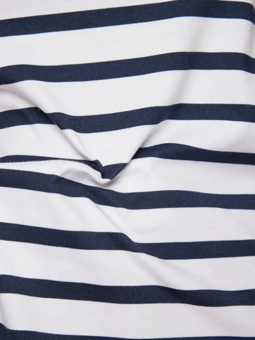 Der große Schriftzug „MAKE SIMPLE“ in dekorativer Strassstein-Optik setzt einen modischen Akzent und sorgt für das gewisse Etwas.Der gerade Schnitt, der angenehme Rundhalsausschnitt und die halblangen Ärmel machen das Shirt zum perfekten Alltagsbegleiter – komfortabel und stilvoll zugleich.Modisches Streifen-Design in Marine und Weiß.Funkelnder Statement-Print mit Strassdetails.Rundhalsausschnitt & halbe Ärmel.Angenehmes Tragegefühl durch elastisches Material.