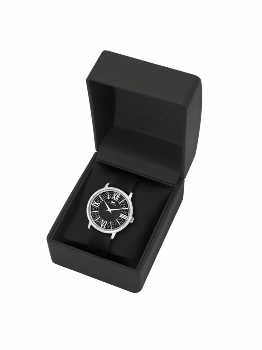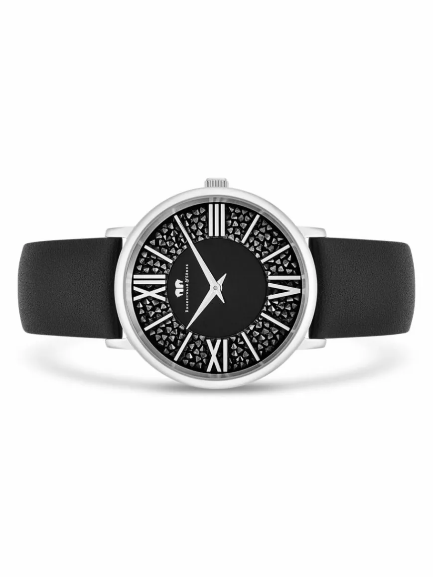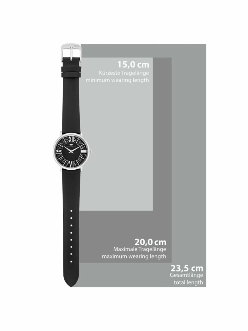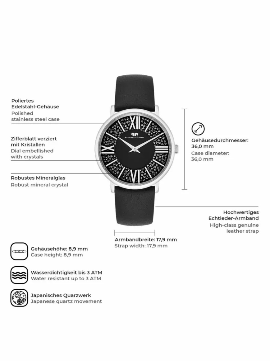 Wenn Sie auf der Suche nach einer exklusiven Uhr mit einem Hauch Glamour sind, dann werden Sie sich in diese Damenuhr des Labels Rhodenwald & Söhne verlieben: Klassische Designelemente und zeitgemäßen Akzente vereinen sich zu einem stilvollen Accessoire. Ein Blickfang ist der Kontrast zwischen der Schlichtheit von Strichindices und Pfeilzeigern und dem aufwändig strukturierten Zifferblatt, verziert mit Kristallen.