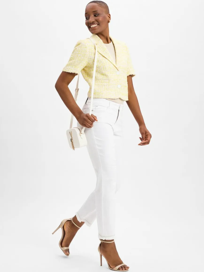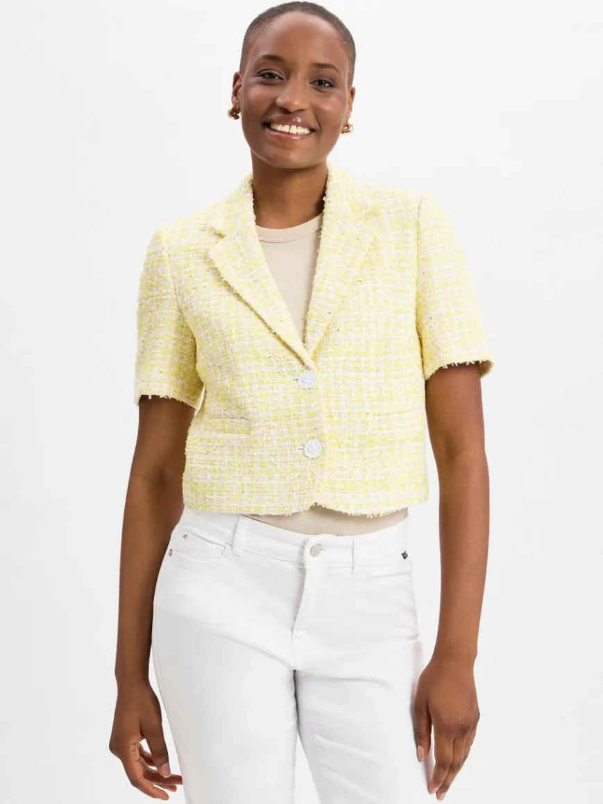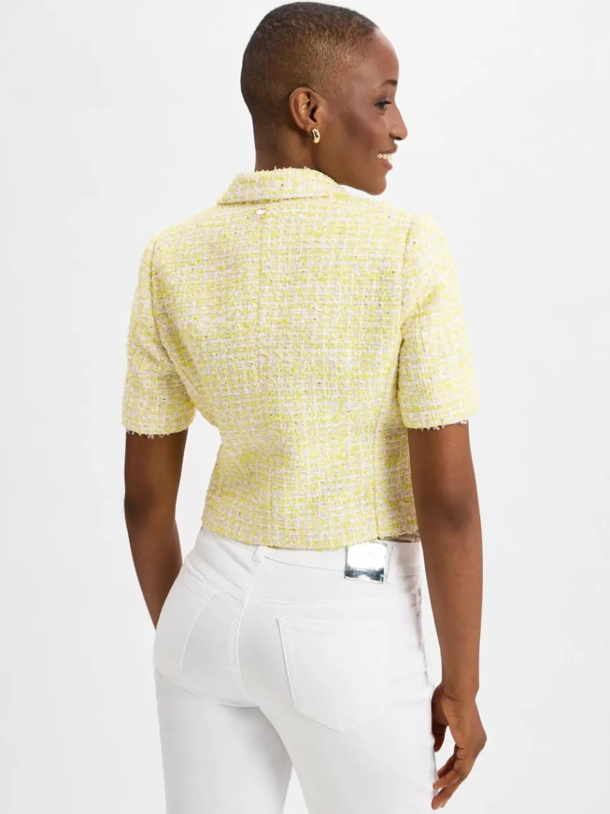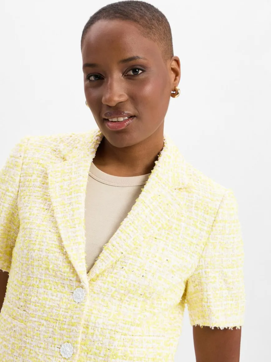 Die Rich & Royal Kurzarm-Bouclé-Kastenjacke mit dezenten Pailletten kombiniert klassischen Charme mit einem Hauch Glamour – perfekt für stilvolle Auftritte.