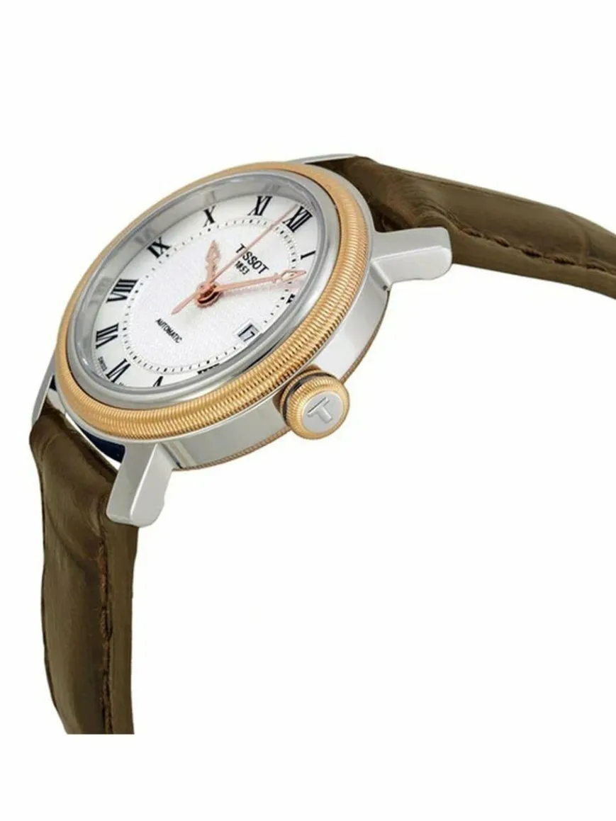 Die TISSOT Bridgeport Automatic Lady ist mit einem Automatikwerk ausgestattet und das Uhrengehäuse ist aus Stahl & PVD gefertigt. Die Uhr hat einen Durchmesser von 29 mm und ist auf eine Wasserdichtigkeit von 5 ATM / 50 Meter getestet. Das Uhrenarmband ist aus Leder gefertigt. Armbandbreite: 20 mm, Gehäusehöhe: 9 mm; Durchmesser: 29 mm; Verschluss: Drehverschluss