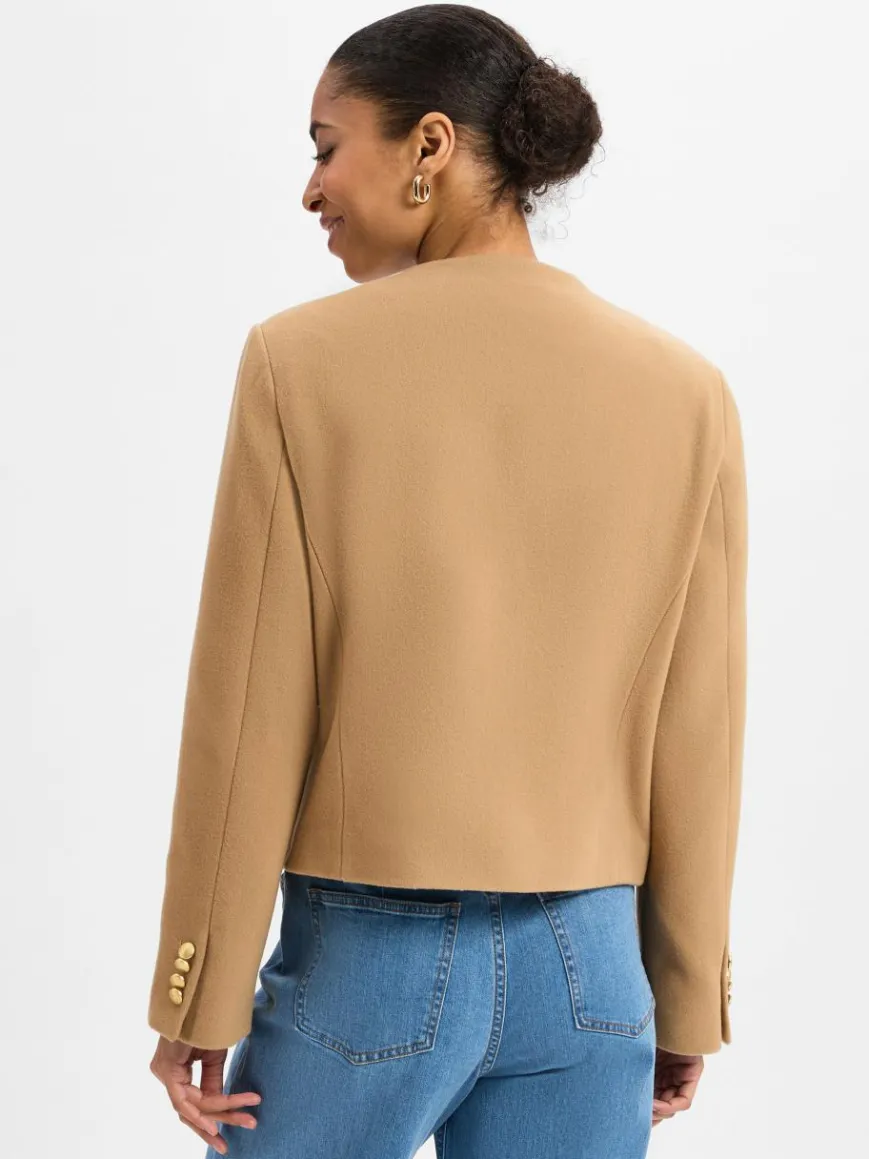 Der Cropped Blazer in Woll-Kunstfaser-Qualität überzeugt durch sein schlichtes Design und die raffinierten Knöpfe.