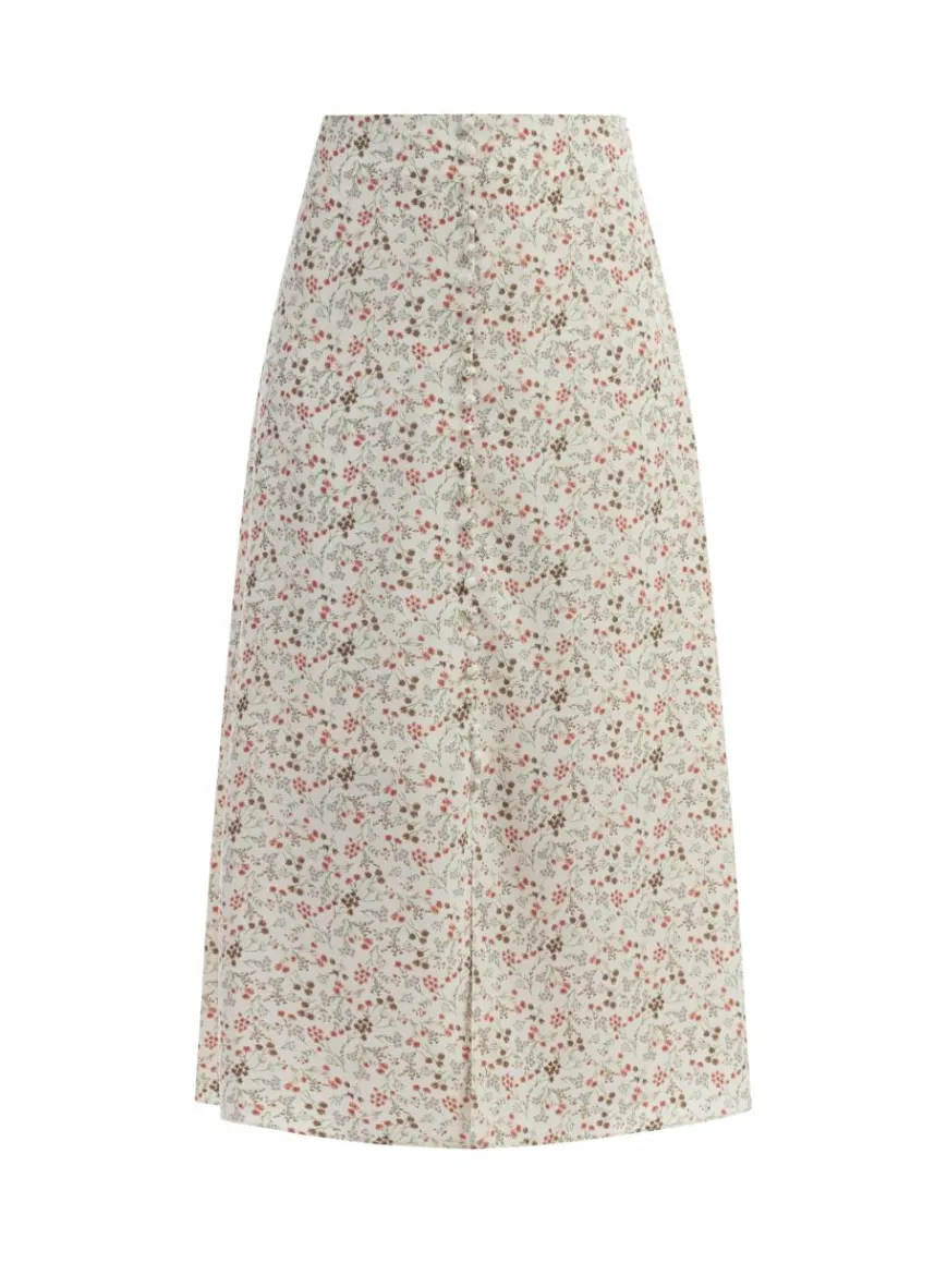 Das zarte florale Muster verleiht dem Rock von usha eine feminine Attitüde. Schmal geschnitten mit ausgestellter Passform hebt er die Romantik in den Fokus. Mit den dekorativen, stoffbezogenen Knöpfen auf der Vorderseite, ist der Rock mittig geschlitzt womit die Femininität noch unterstützt wird. Abgerundet wird das Modell durch ein geschmeidiges Innenfutter und einen seitlichen Reißverschluss.
