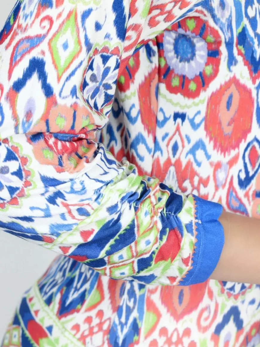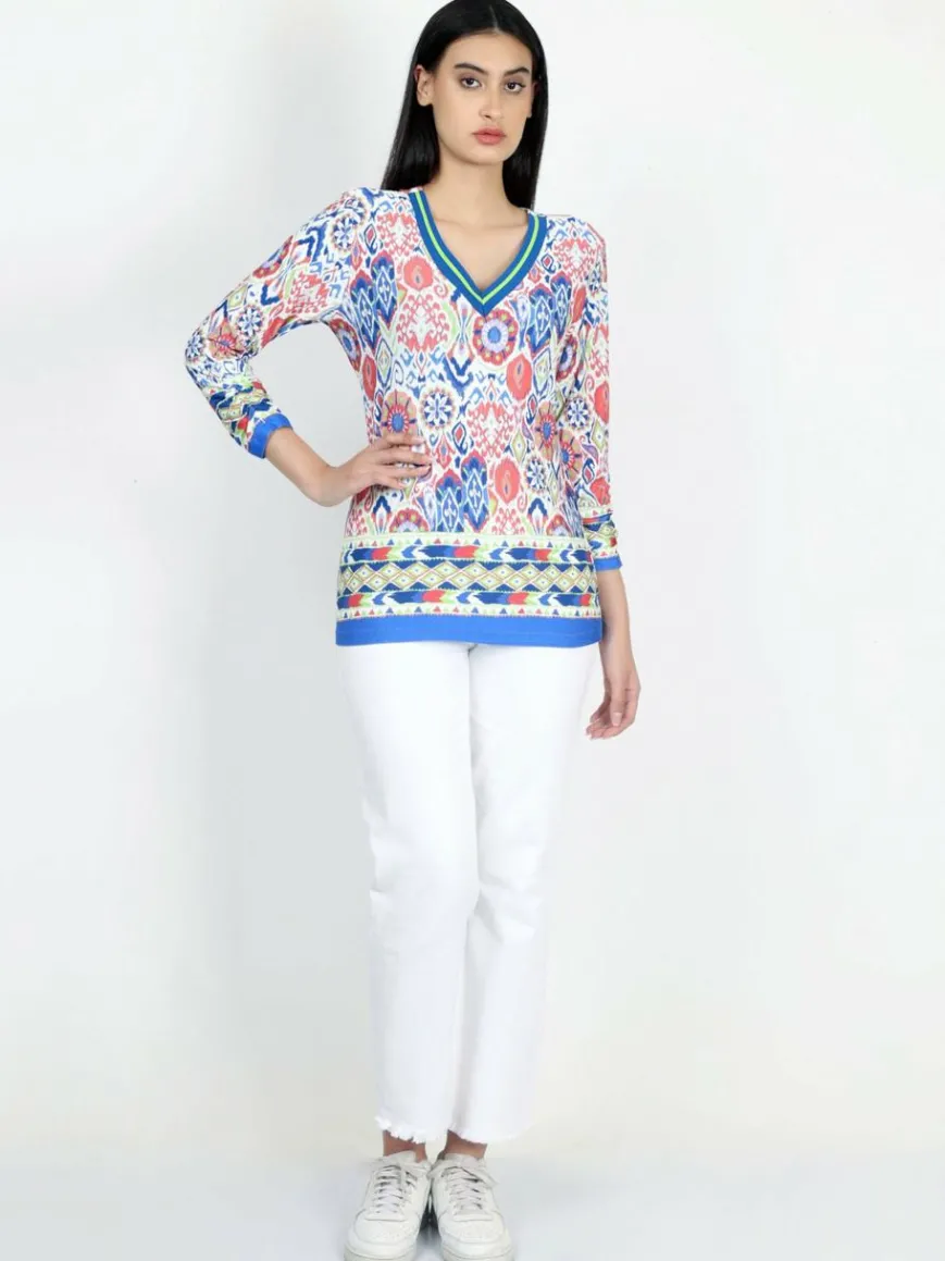 Die leichte, lässige Bluse mit abstraktem Druck ist im Alltag und im Urlaub ein modischer Hingucker. Die 3/4-Ärmel mit Bordüren-Details am Saum und das glänzende V-Ausschnittband unterstreichen den lässigen Look. Kombinieren Sie es einfach mit Jeans oder unseren Hosen im passenden Aufdruck! Gesamtlänge: 64 cm, Brustweite: 92 cm, Taillenweite: 88 cm.