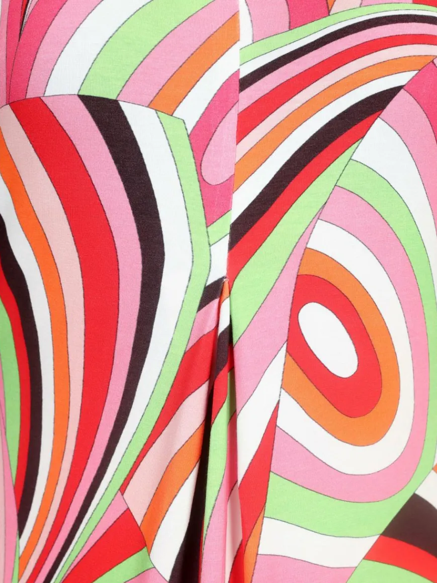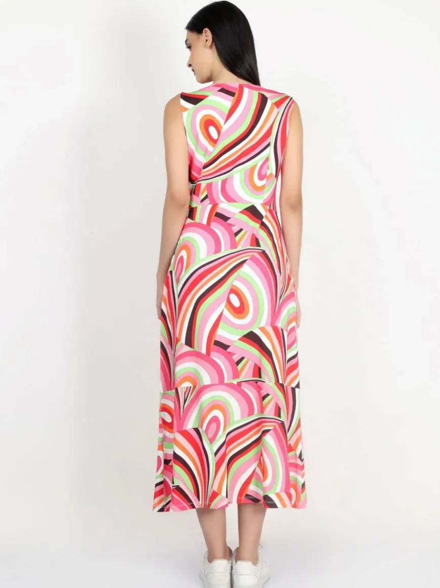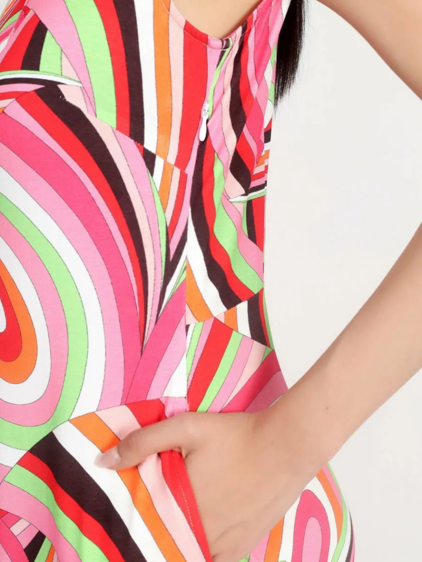 Ärmellose Maxi Jerseykleid in bequemer Passform aus weicher Viskosequalität mit wunderschönem mehrfarbigem Druck. A-Linien-Schnitt, modische Länge, Seitentaschen und seitlicher Reißverschluss für einfaches Tragen.