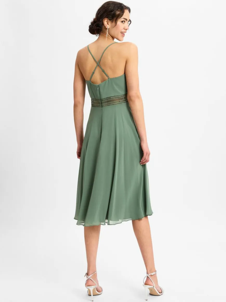Mit grafischer Häkelspitze in der Taille und angesagter Midi-Länge passt sich das stilvolle VM Kleid aus zartem Chiffon dem modernen Zeitgeist an.