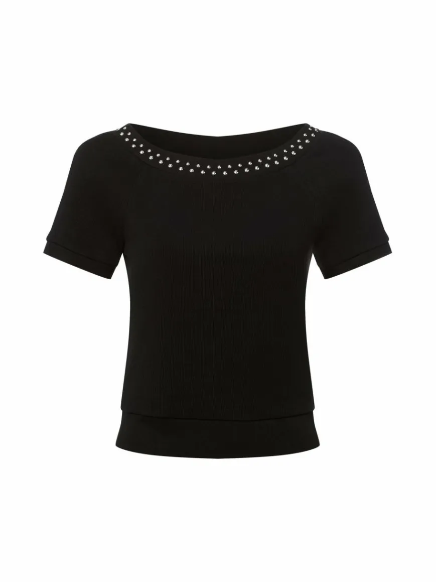 Die gerundeten Nieten am weiten Ausschnitt bringen das stretchige Rippshirt von zero zum Glänzen.