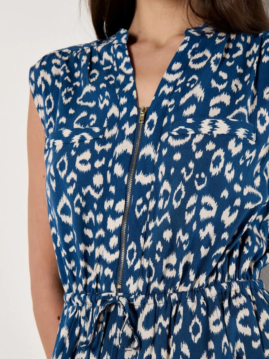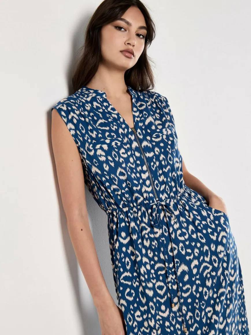 Dieser leichte, gewebte Midi mit zeitlosem Tierprint ist ein absolutes Must-have. Das ärmellose Modell mit V-Ausschnitt hat einen durchgehenden Reißverschluss, dekorative aufgesetzte Brusttaschen und einen Kordelzug in der Taille für eine bequeme Passform. Es ist mit praktischen Seitentaschen ausgestattet.