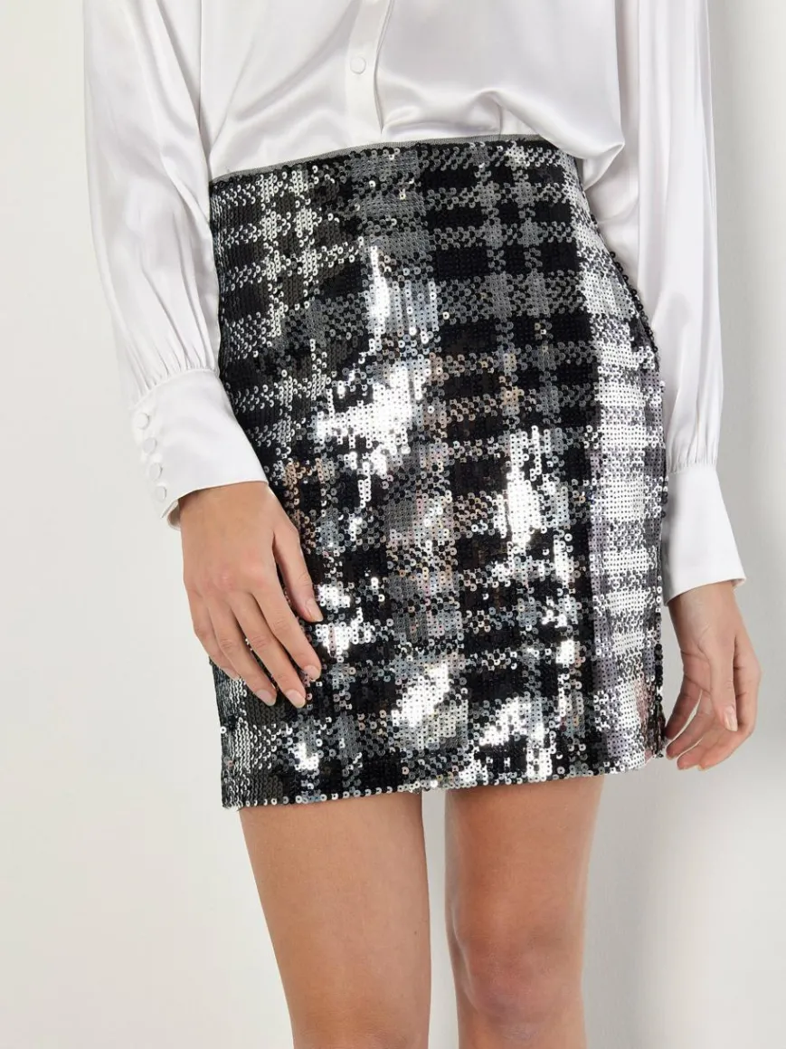 Schimmern und glänzen Sie nach Einbruch der Dunkelheit in diesem mit Pailletten besetzten Minirock. Er ist gefüttert und hat eine schmeichelhafte, figurbetonte Passform, einen elastischen Bund und ein Karomuster.