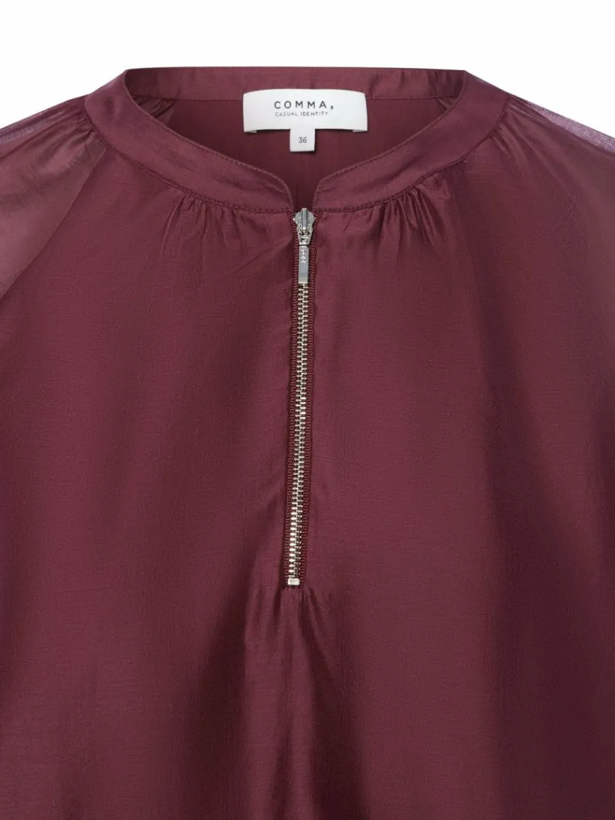 Das Blusenshirt von comma casual identity begeistert mit transparenten Ärmelpartien, kurzem Zipper und elastischen Bündchen – ideal für casual-elegante Looks.
