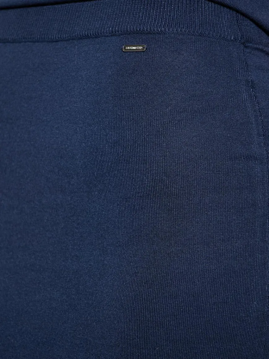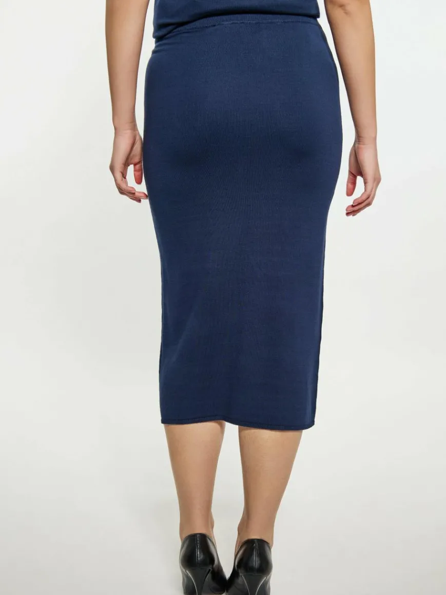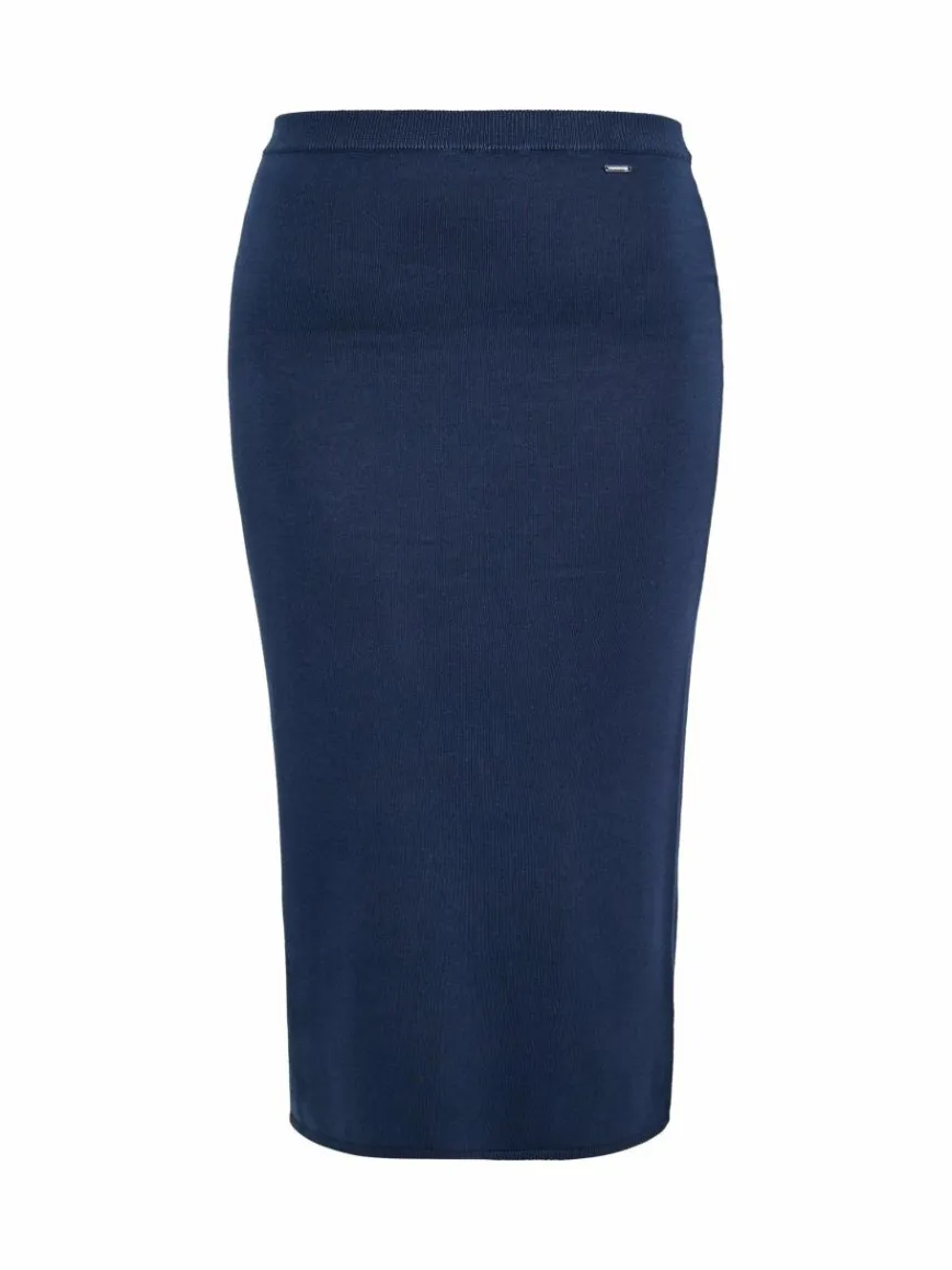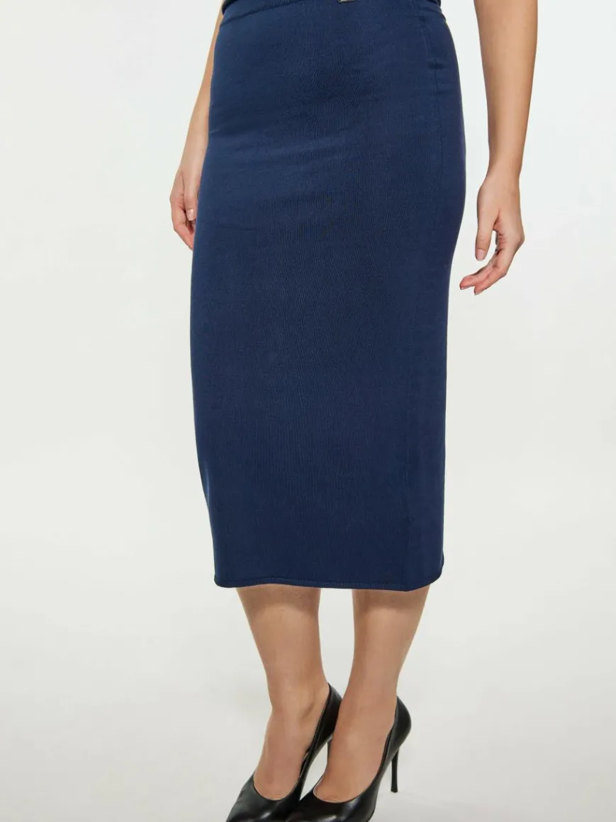 This elegant midi pencil skirt boasts a slim fit silhouette, perfect for a chic and classic look. Crafted from knitwear, it offers comfort and flexibility with its stretchable waistband. The clean design makes it versatile for various occasions, while the discreet brand emblem adds a touch of sophistication piece.