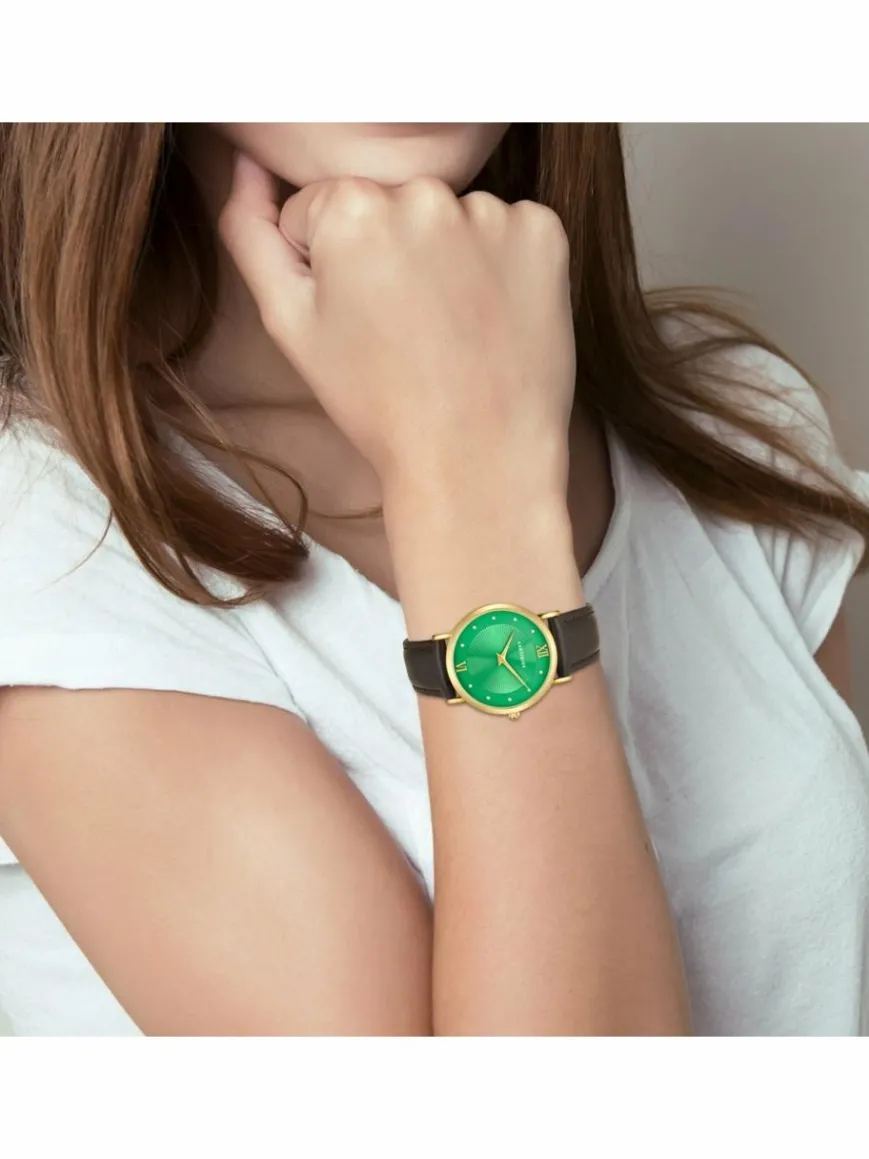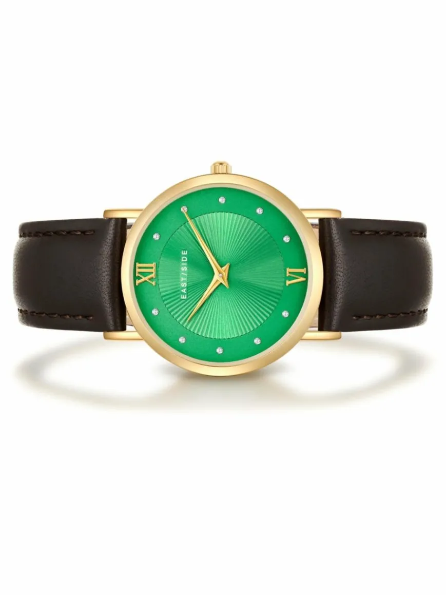 Sie mögen Uhren, die klassische Horlogerie-Werte mit modernen Vibes vereinen? Dann ist dieses Damenmodell des jungen Labels EASTSIDE der neue Star in Ihrer Uhrensammlung. Das runde Gehäuse mit Plattierung in Gelbgold bildet den edlen Rahmen für ein Sonnenschliff-Zifferblatt, das gekonnt mit Lichtreflektionen spielt, ansonsten aber bewusst auf Understatement setzt. Dezente Zifferblattmarkierungen und Dauphinzeiger zahlen perfekt auf diesen Stil ein.