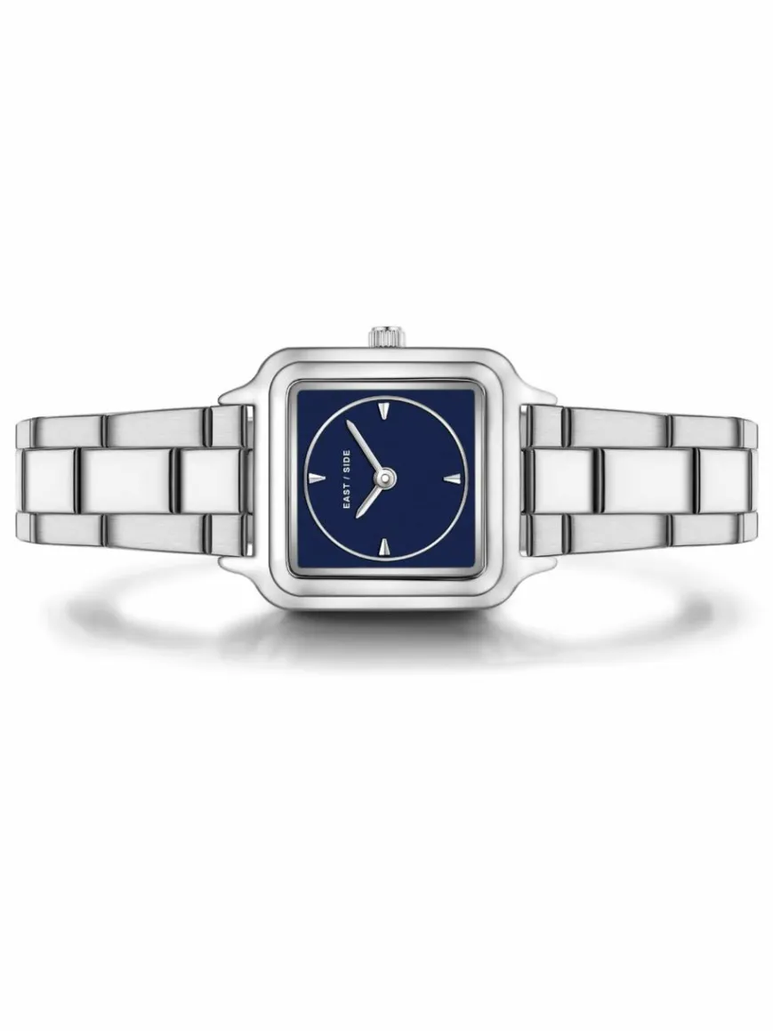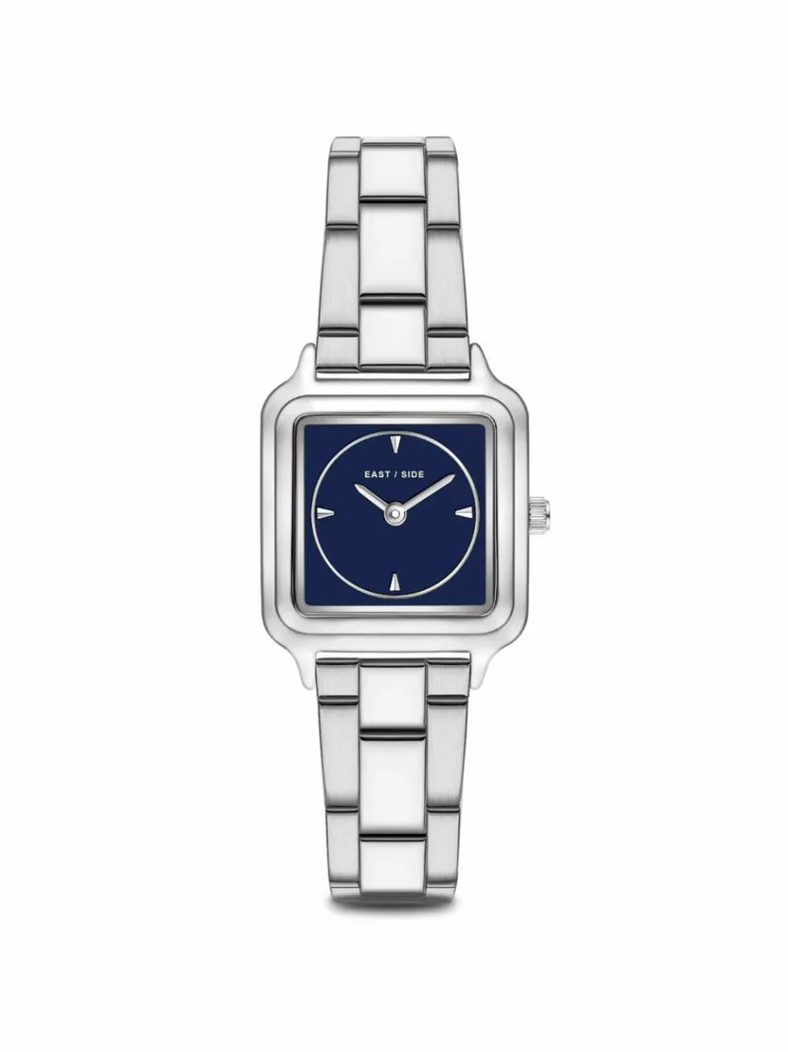 Dieser außergewöhnliche Zeitmesser des jungen Labels EASTSIDE ist ein Must-Have für Frauen, die stilvolle Accessoires mögen. Klassische Horlogerie-Legenden standen Pate für das luxuriöse Design, das alle Uhrenliebhaberinnen begeistert: Das eckige Gehäuse mit breiter Lünette umrahmt ein dunkel schimmerndes Perlmutt-Zifferblatt mit minimalistisch eingesetzten Strichindizes und dezenten Stabzeigern.