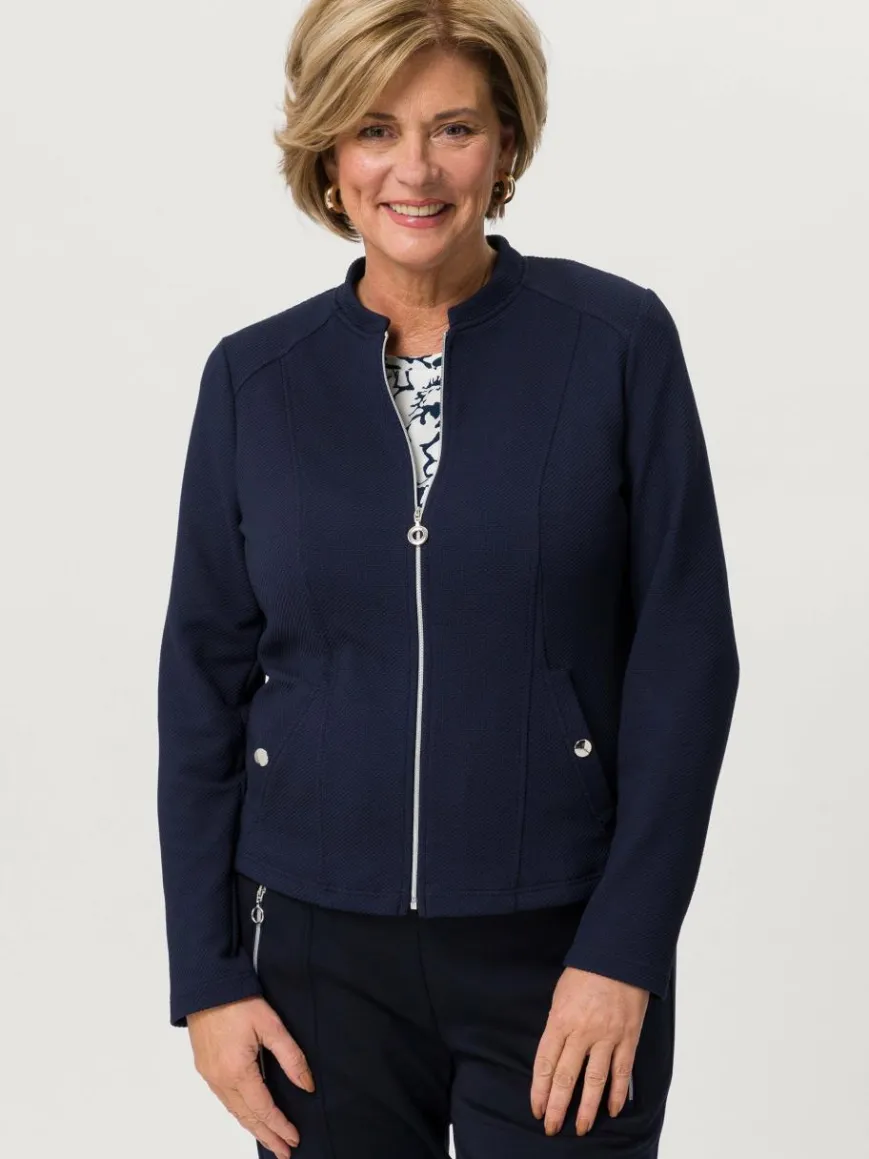 Blazerjacke mit strukturierter Oberfläche und dezenten Eingrifftaschen mit Zierknopfdetails. Chice Teilungsnähte sorgen für eine tolle Passform. Der unkomplizierte Style bietet vielseitige Kombinationsmöglichkeiten nicht nur im Alltag. Mit femininem Stehbund und Reißverschluss.