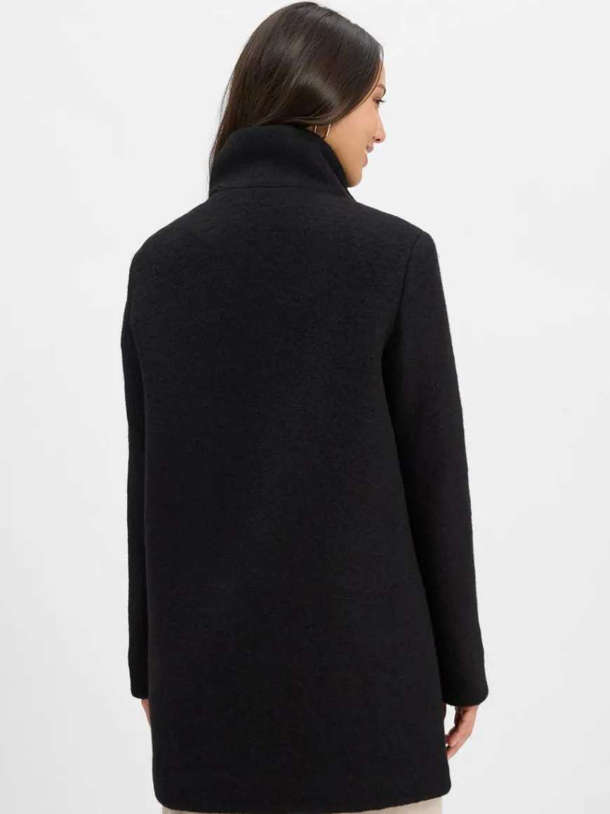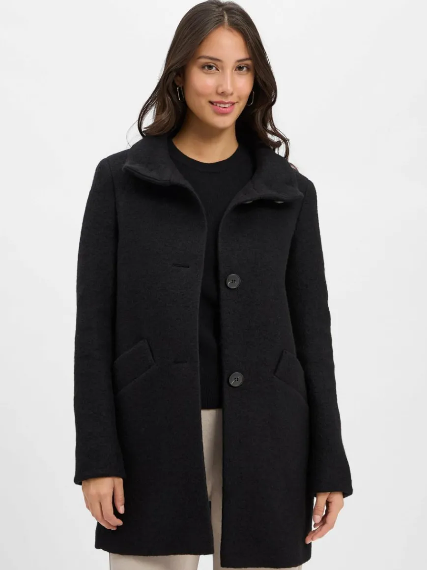 Mit cleaner Silhouette, hohem Stehkragen und leichter Woll-Mix-Qualität erweist sich die lange Jacke von Fuchs Schmitt als idealer Übergangsbegleiter.