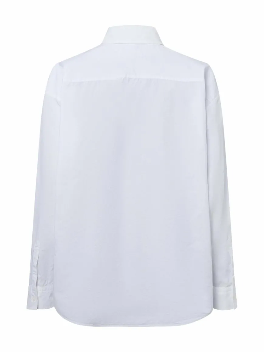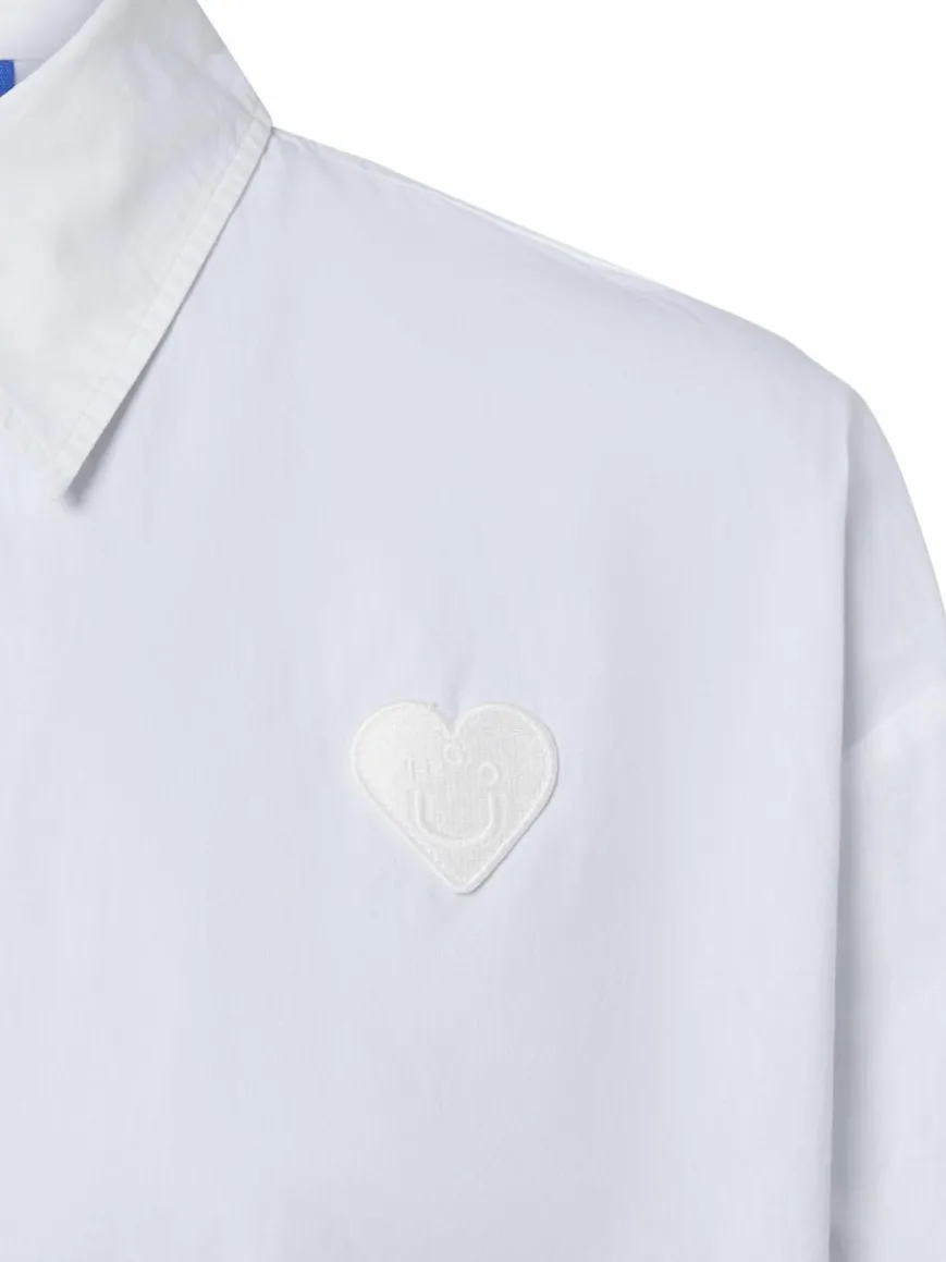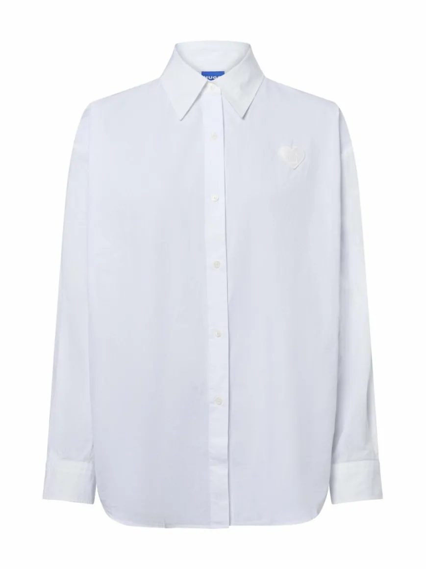 Die Hemdbluse Zirveli von Hugo Blue begeistert in weiter Passform aus glatter Baumwolle mit Hemdblusenkragen, langen Ärmeln samt 1-Knopf-Manschette und einem dezenten Logo-Patch auf Brusthöhe.