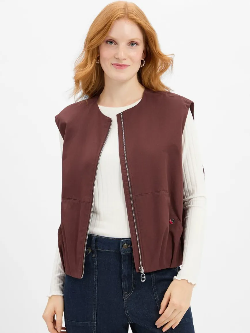 Die HUGO Weste Azelda-1 aus reiner Baumwolle fällt durch ihren Zipper, die beiden Eingrifftaschen mit Druckknöpfen und den Saum mit Faltendetails auf.