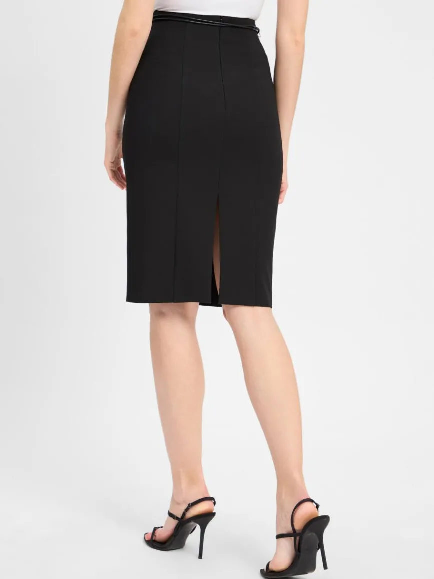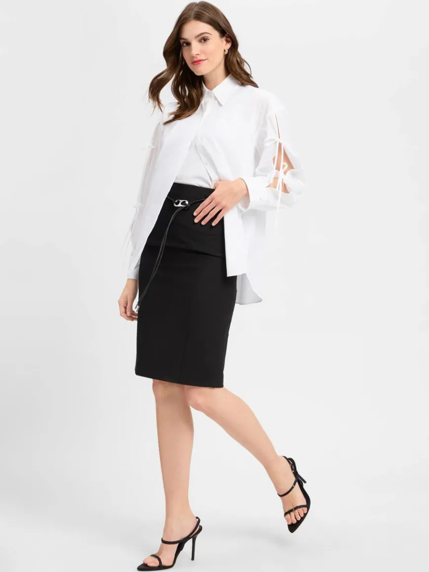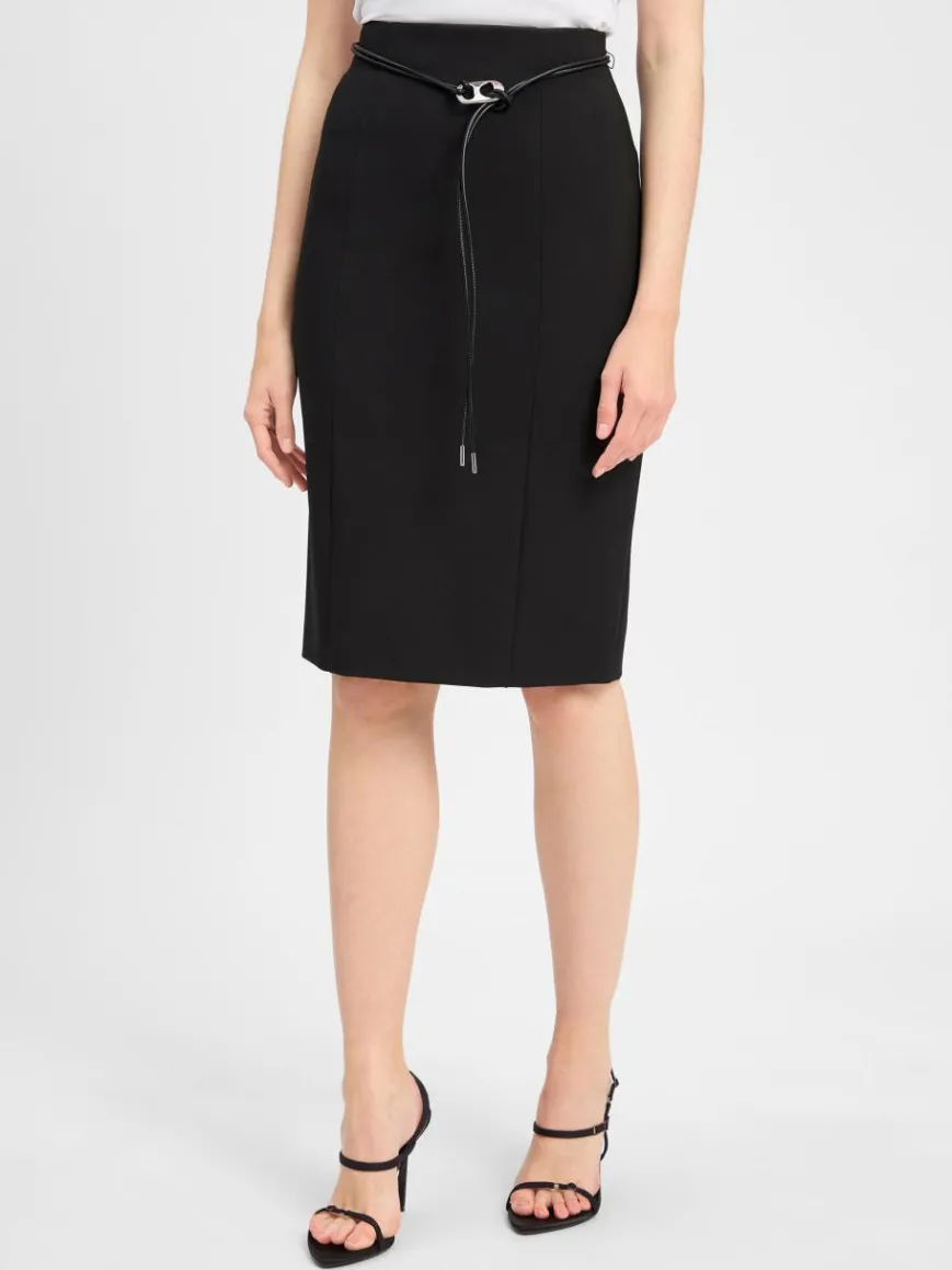 Der Bleistiftrock Ropinea von HUGO interpretiert den klassischen, figurbetonten Schnitt neu und verleiht ihm mit der rockig-modernen Kunstleder-Bindekordel ein edgy Style-Update mit Statement-Charakter.