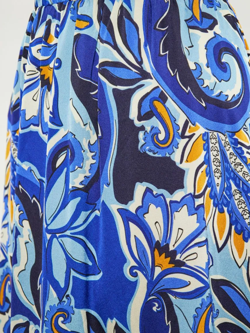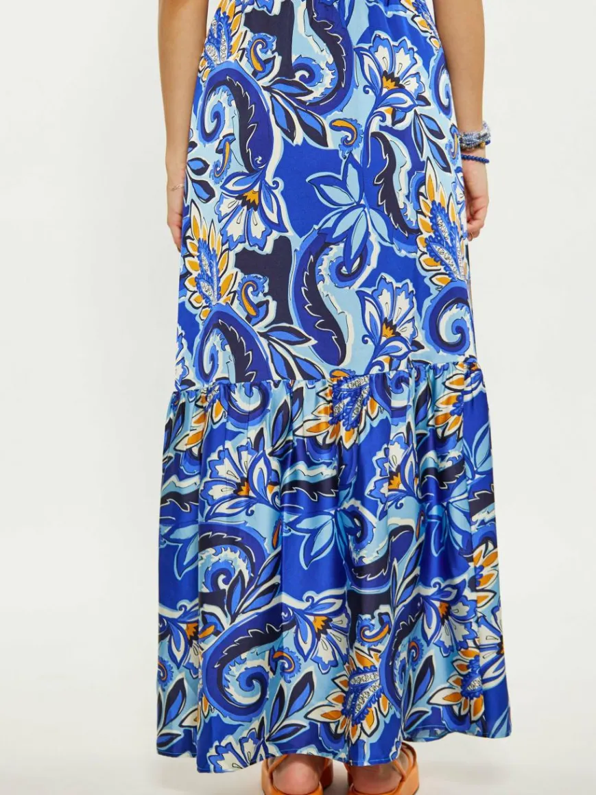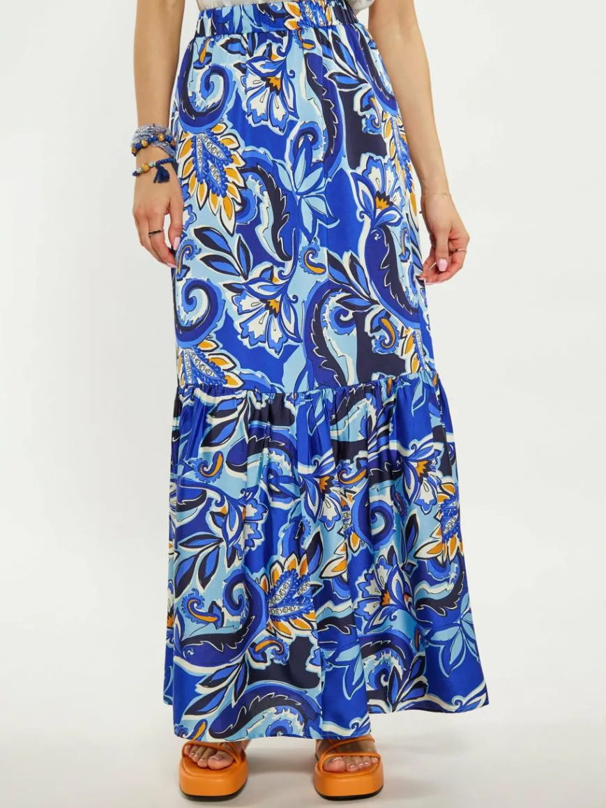 This printed maxi skirt with elastic waistband is a stylish addition to your closet, perfect for the modern woman. Featuring a floral pattern and paisley design, this summer skirt has a fitted waistband and a flattering A-line silhouette. The layered design with ruffle detailing adds a touch of whimsy to this airy and lightweight piece, ensuring that you’ll look perfect wherever you go.