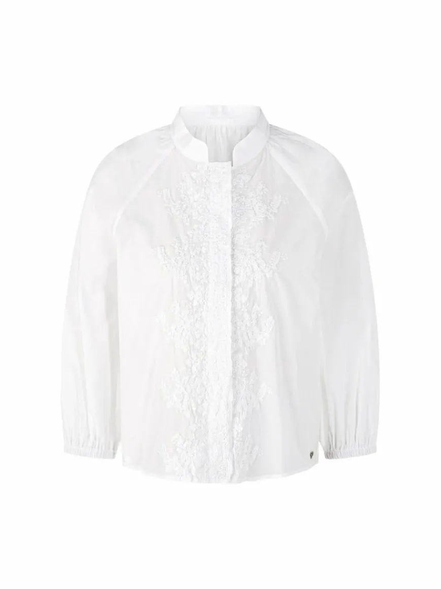 Die Bluse im Boho-Stil kommt mit einem dünnen Stehkragen und Raglanärmeln. Besonderes Detail ist die verdeckte Knopfleiste, die zu beiden Seiten mit einem verspielten Blumenmuster bestickt ist. Der reine Baumwollstoff ist leicht transparent und sorgt für ein komfortables Tragegefühl. Die Ärmel haben eine dreiviertel Länge und sind am Ende mit einem Gummizug gerafft.