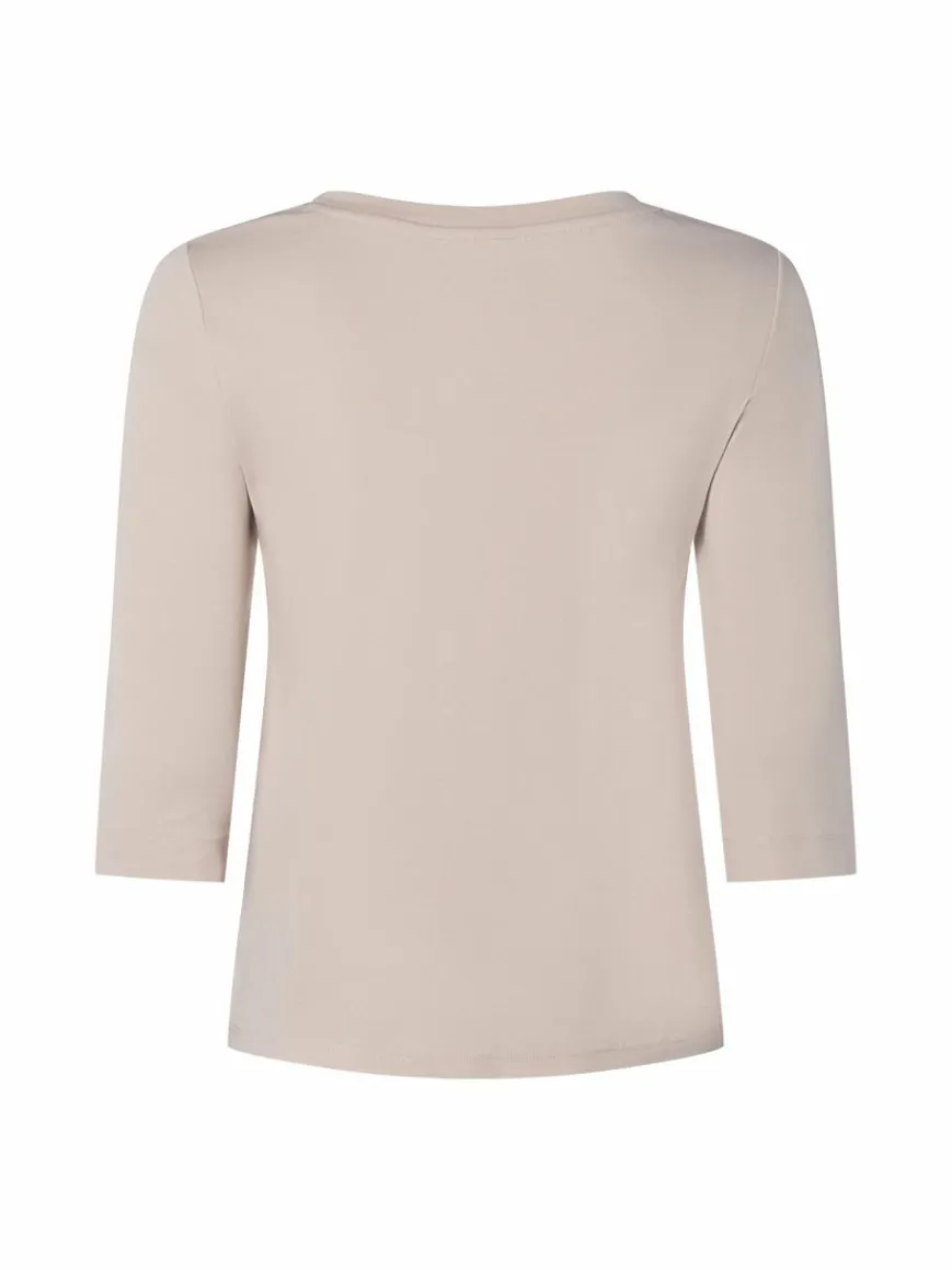 Das Shirt von Marc Cain Collections überzeugt mit seiner stretchigen Baumwollqualität und einer feinen Stickerei am Halsausschnitt – ein elegantes Detail für einen stilvollen Auftritt.