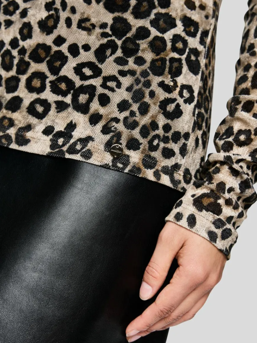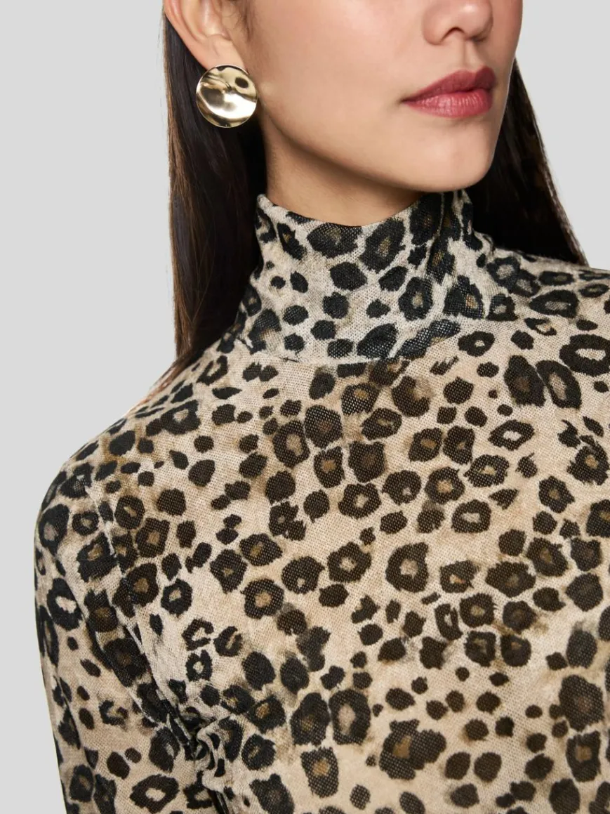 Dieses semi-transparente Longsleeve begeistert mit seiner Velours-Haptik und dem auffälligen Leo-Print. Der körpernahe Schnitt betont die Silhouette, während das hohe Turtleneck für einen modernen, eleganten Look sorgt. Das Oberteil ist vielseitig und ein echter Hingucker für besondere Anlässe oder den Alltag.