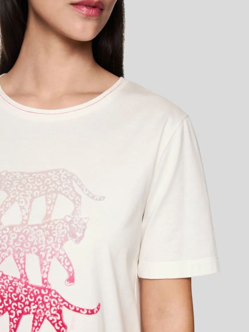 Baumwollshirt mit lockerer Passform und etwas weiterem Halsausschnitt mit farblichem Akzent. Highlight des T-Shirts ist der samtige Leoparden Aufdruck auf der Vorderseite. Seitlich ist das Marc Cain Sports Logo angebracht. Die Produktion erfolgt nach ökosozialen Kriterien und die Jacke trägt das Nachhaltigkeitslabel
