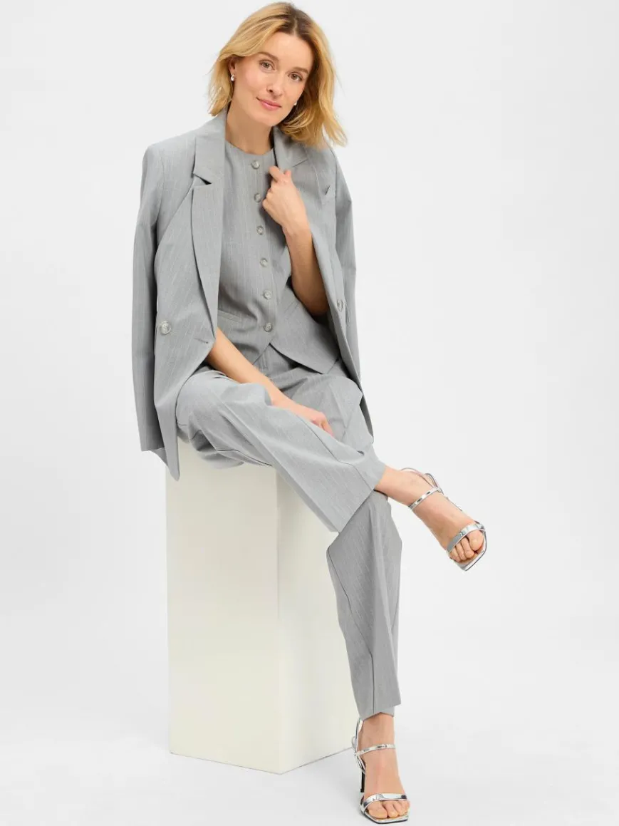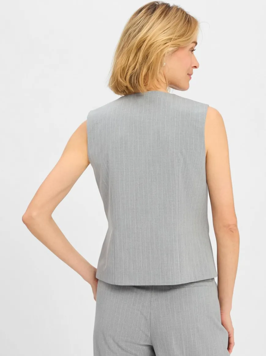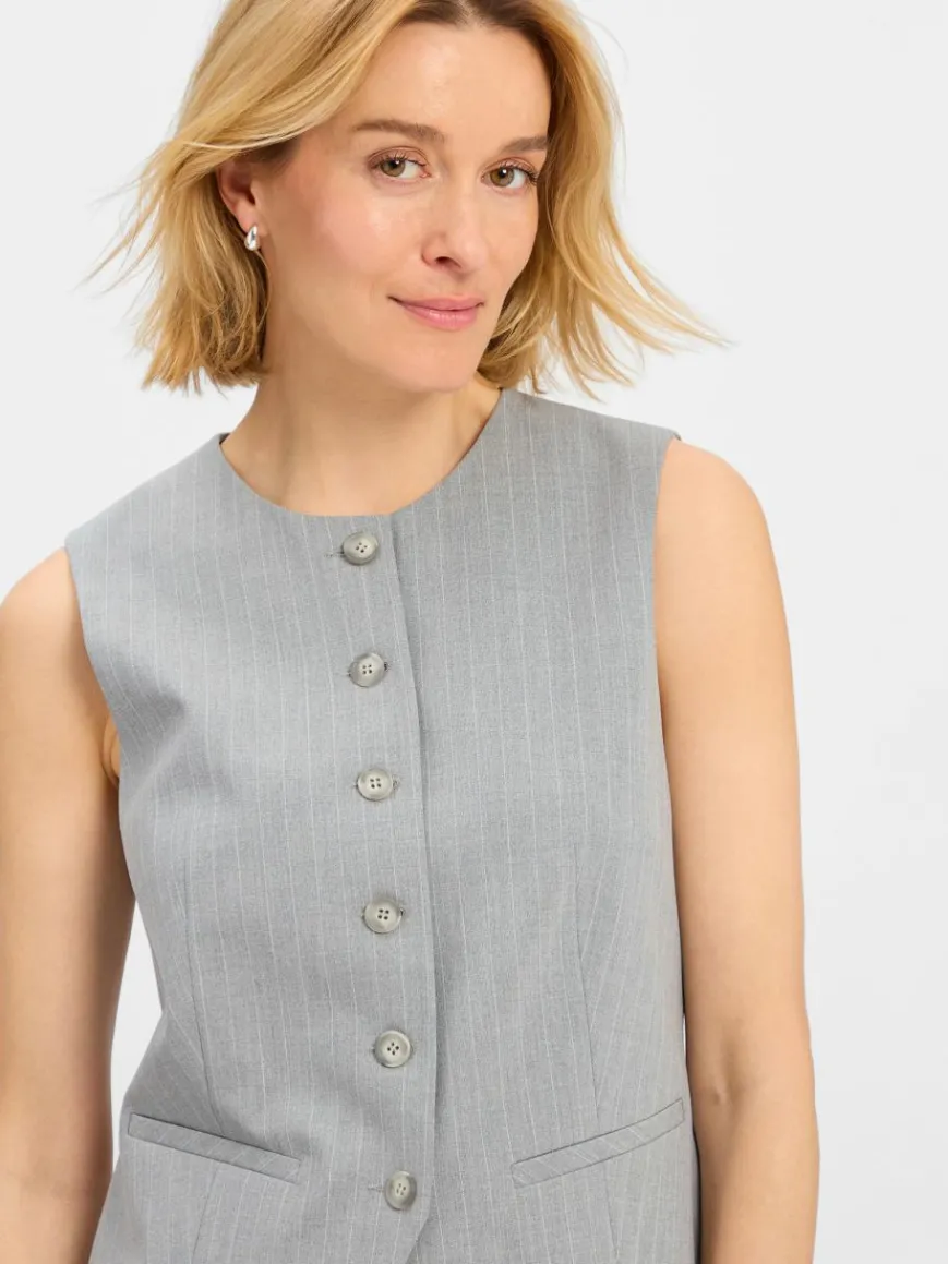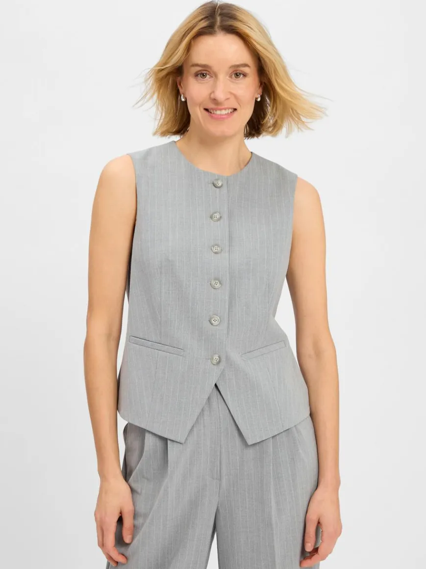 Taillierte Weste von Marie Lund aus stretchigem Viskose-Mix mit Rundhalsausschnitt, durchgehender Knopfleiste und zwei dezenten Leistentaschen – perfekt für einen modernen, femininen Look mit klaren Linien. Die Weste ist Teil eines Baukasten-Anzugs, kann aber auch allein getragen werden.
