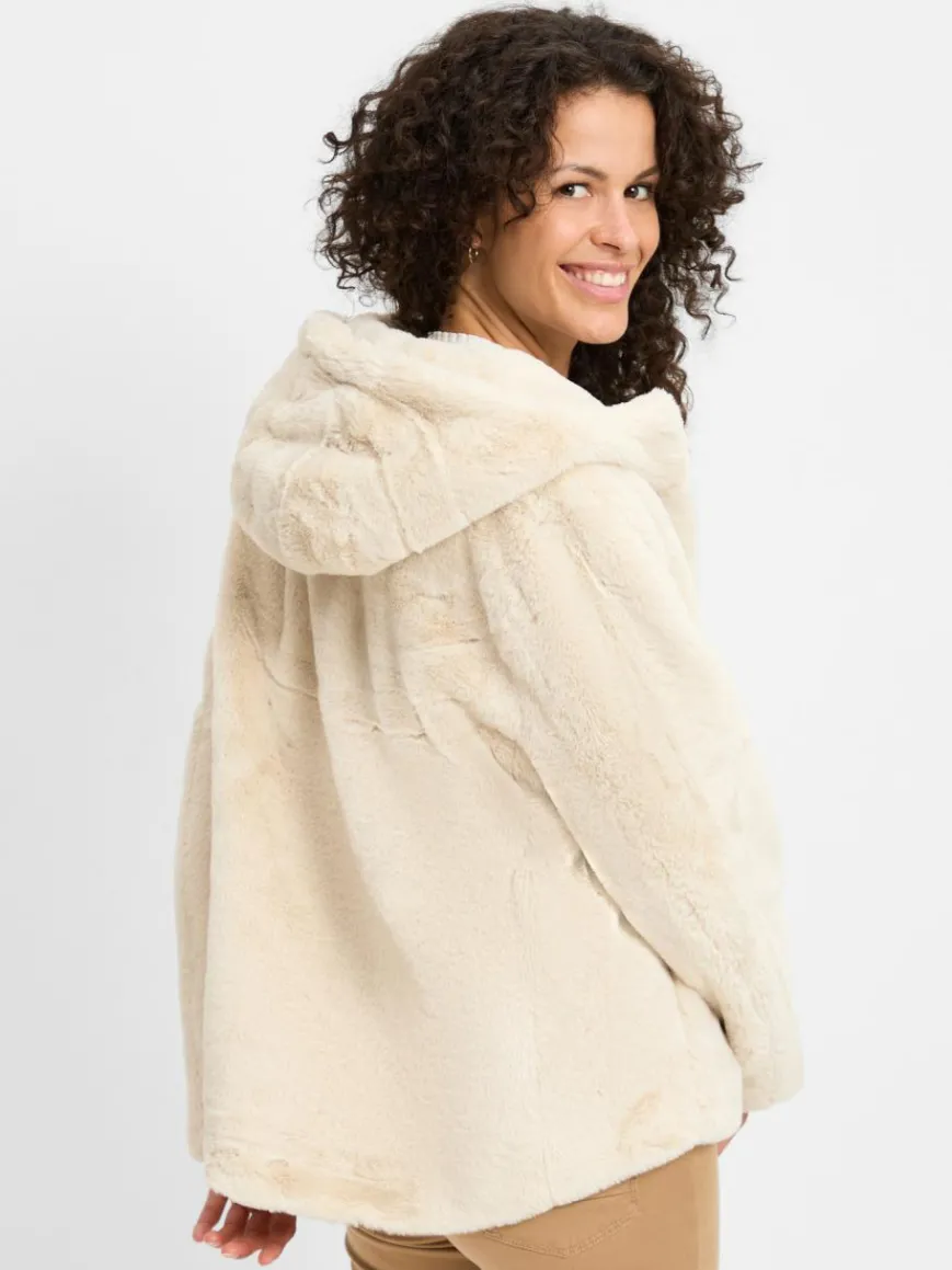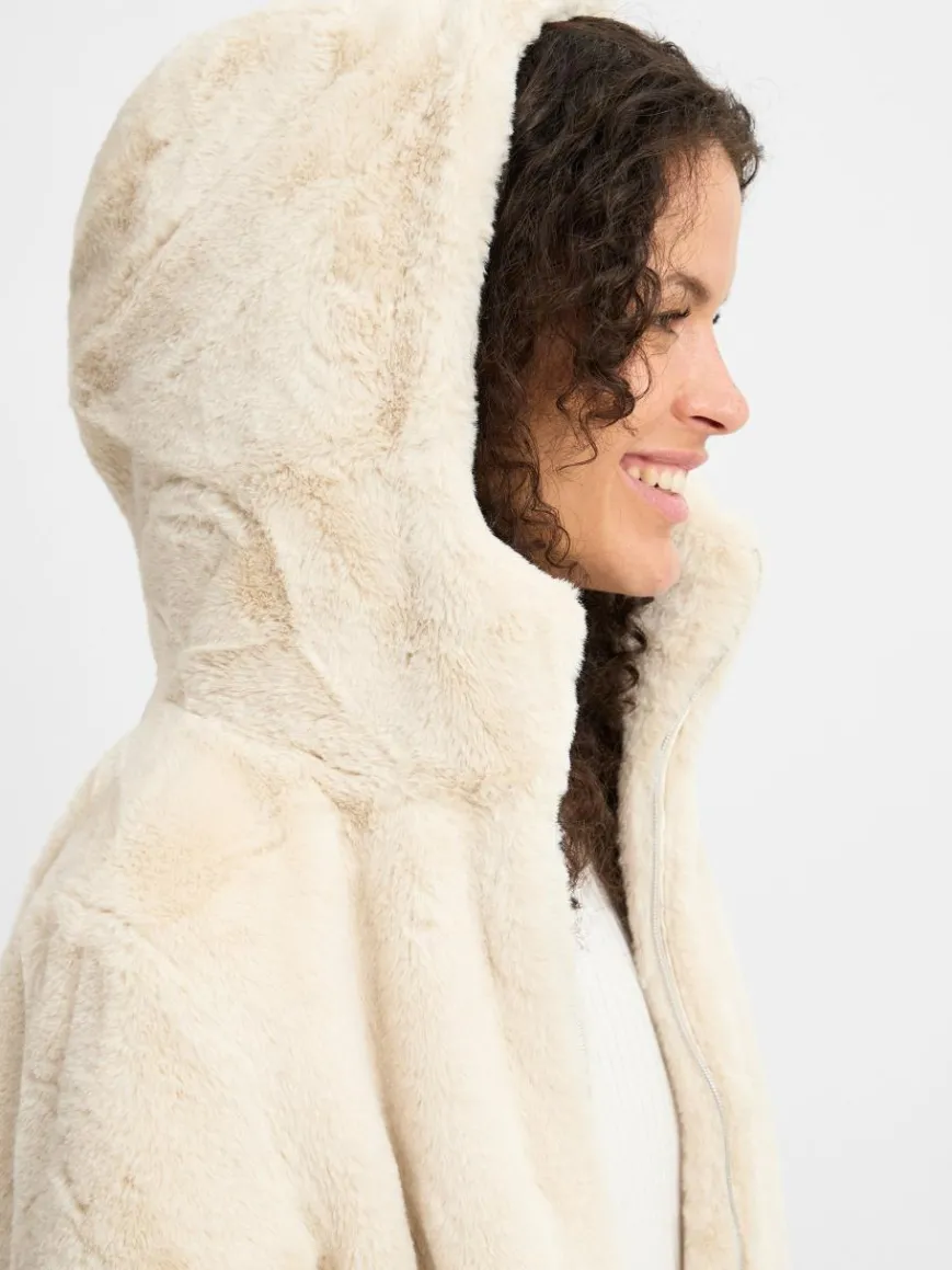 Extrem kuschelig: Diese Kapuzenjacke von Marie Lund aus superweichem Faux Fur ist drinnen wie draußen ein Blickfang.