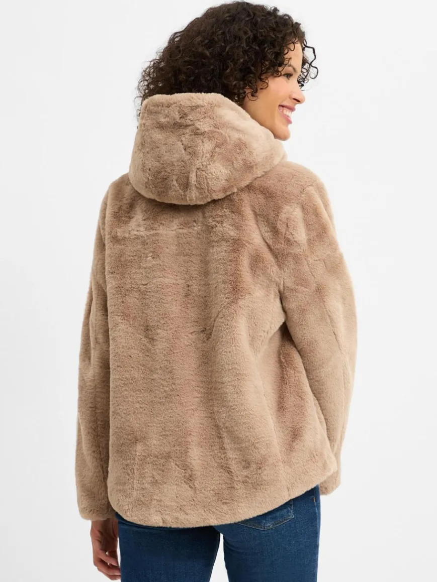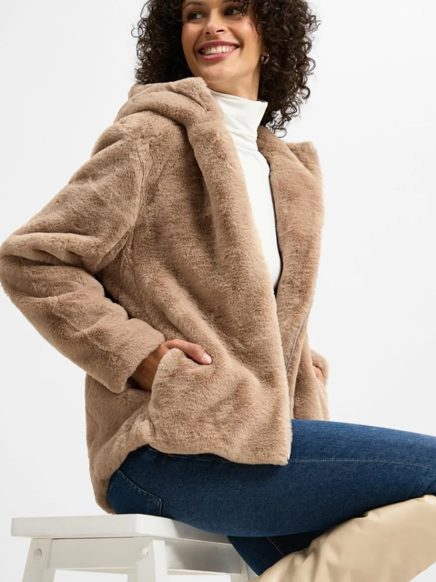 Extrem kuschelig: Diese Kapuzenjacke von Marie Lund aus superweichem Faux Fur ist drinnen wie draußen ein Blickfang.