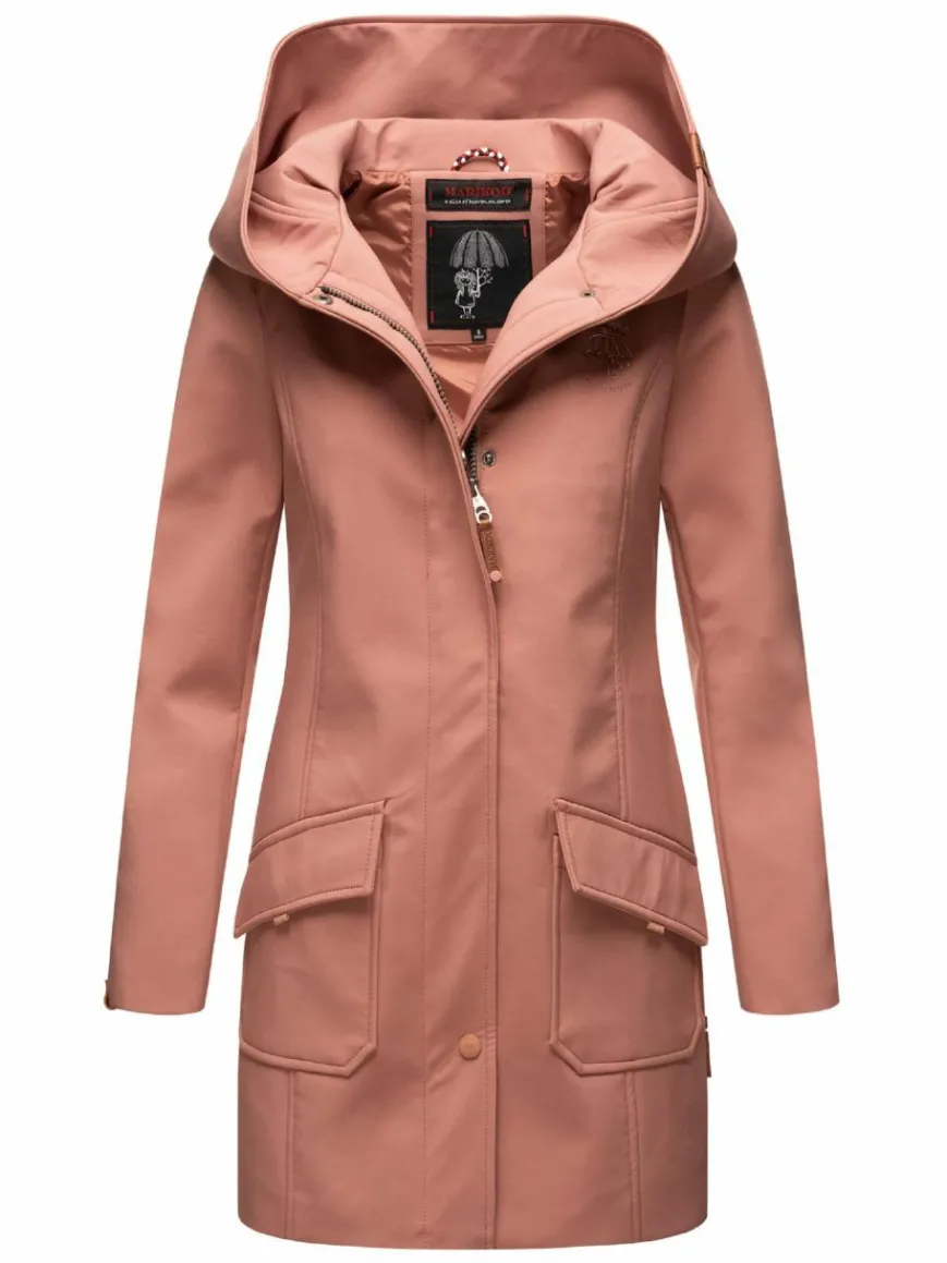 Modischer Damen Softshell-Mantel mit großer Kapuze, Klappentaschen und Druckknopfleiste – ein super Allrounder für die kühlere Jahreszeit (Frühling und Herbst).