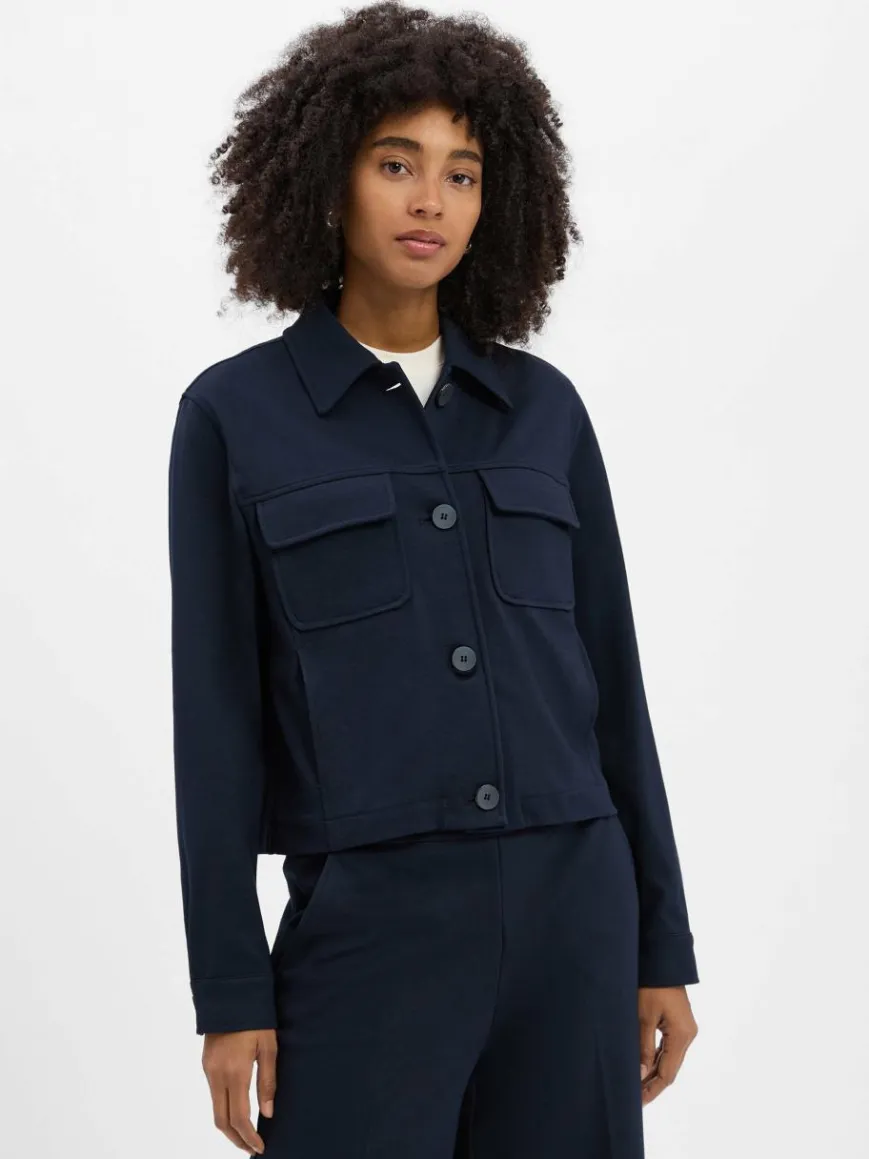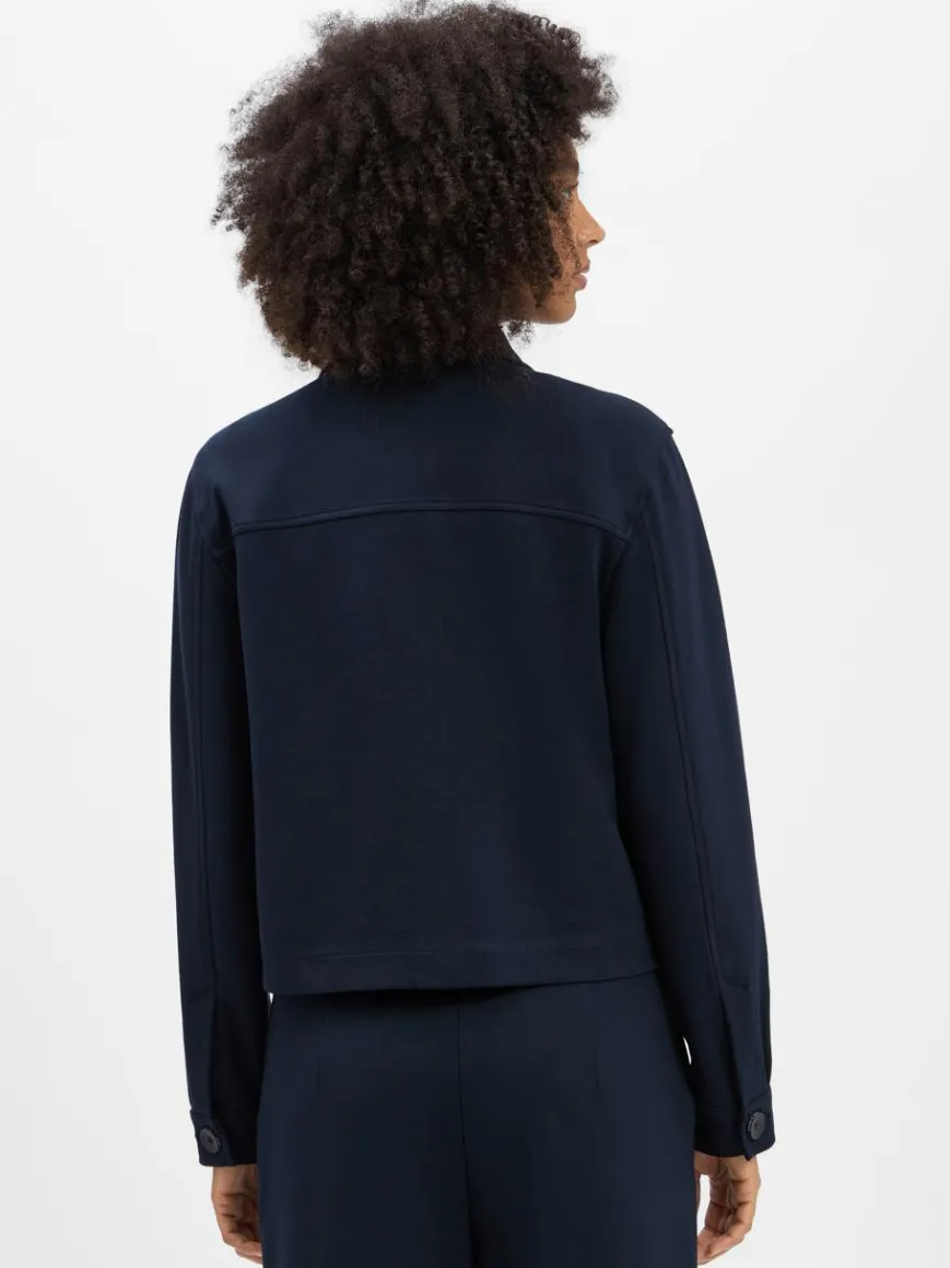 Die More & More Blazerjacke schafft einen perfekten Mix aus klassisch-eleganten Elementen wie dem Umlegekragen und sportiven Details wie der Jersey-Qualität und plakativen Brusttaschen.
