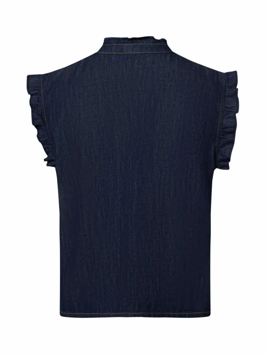 Das More & More Blusentop aus softem Baumwoll-Denim mit Rüschen am Ärmelabschluss vereint lässigen Jeans-Look mit femininen Details.