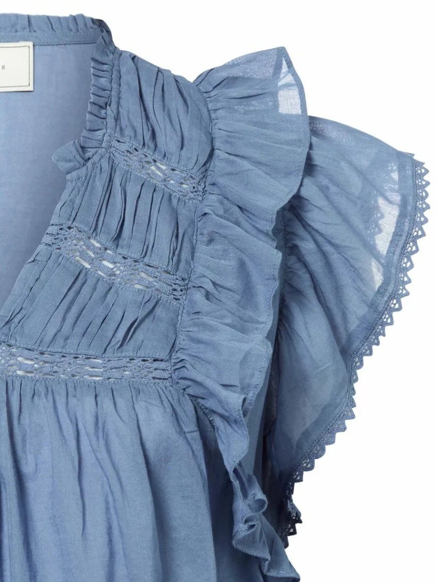 Das Neo Noir Jayla Blusentop aus leichter Baumwolle verleiht durch zarte Rüschen- und Spitzendetails einen romantischen Touch.