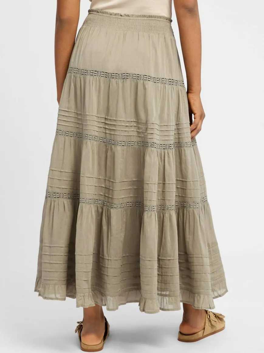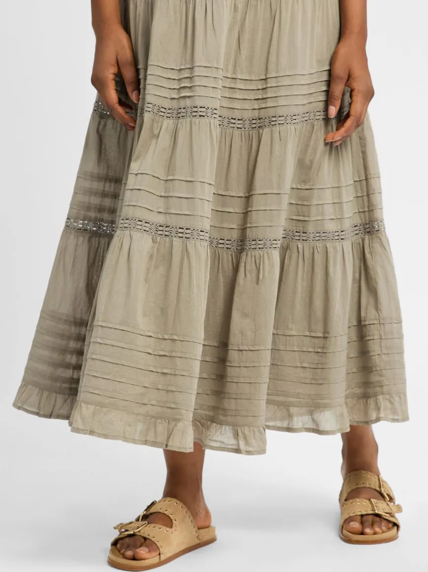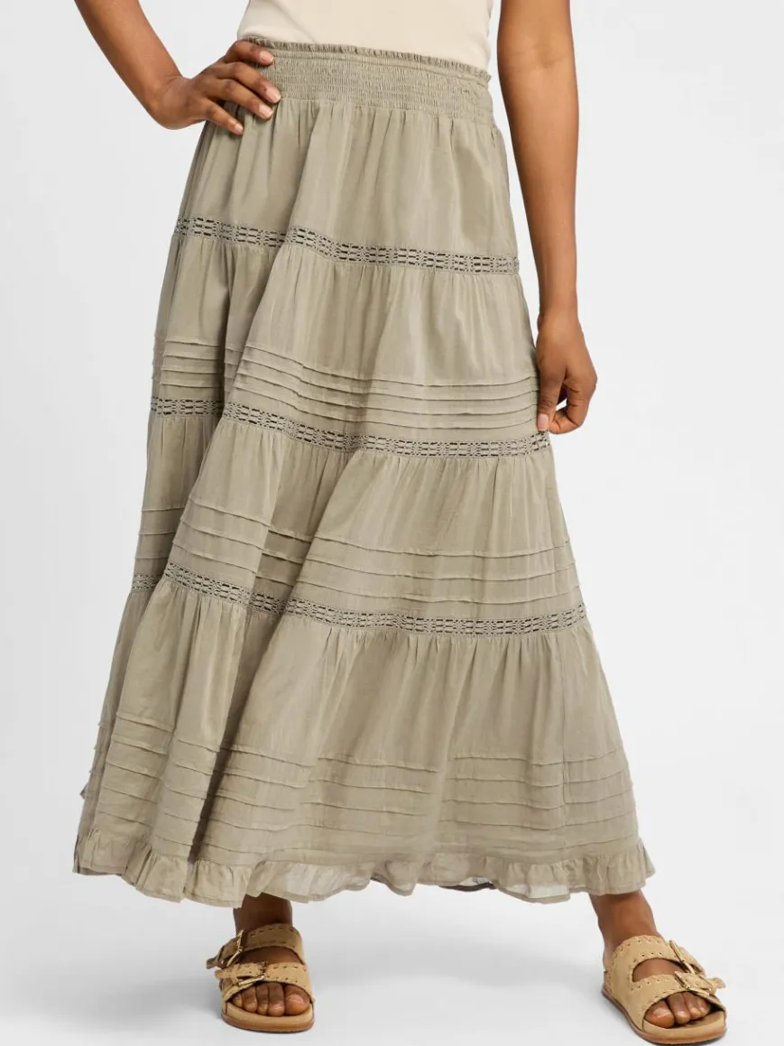 Der Maxirock aus luftigem Baumwoll-Voile, verziert mit verspielten Bändchendetails und einer elastischen, gesmokten Taille, kombiniert stilvolle Leichtigkeit mit Komfort – das ideale Kleidungsstück für entspannte Tage im Alltag oder im Urlaub, kreiert von Neo Noir.