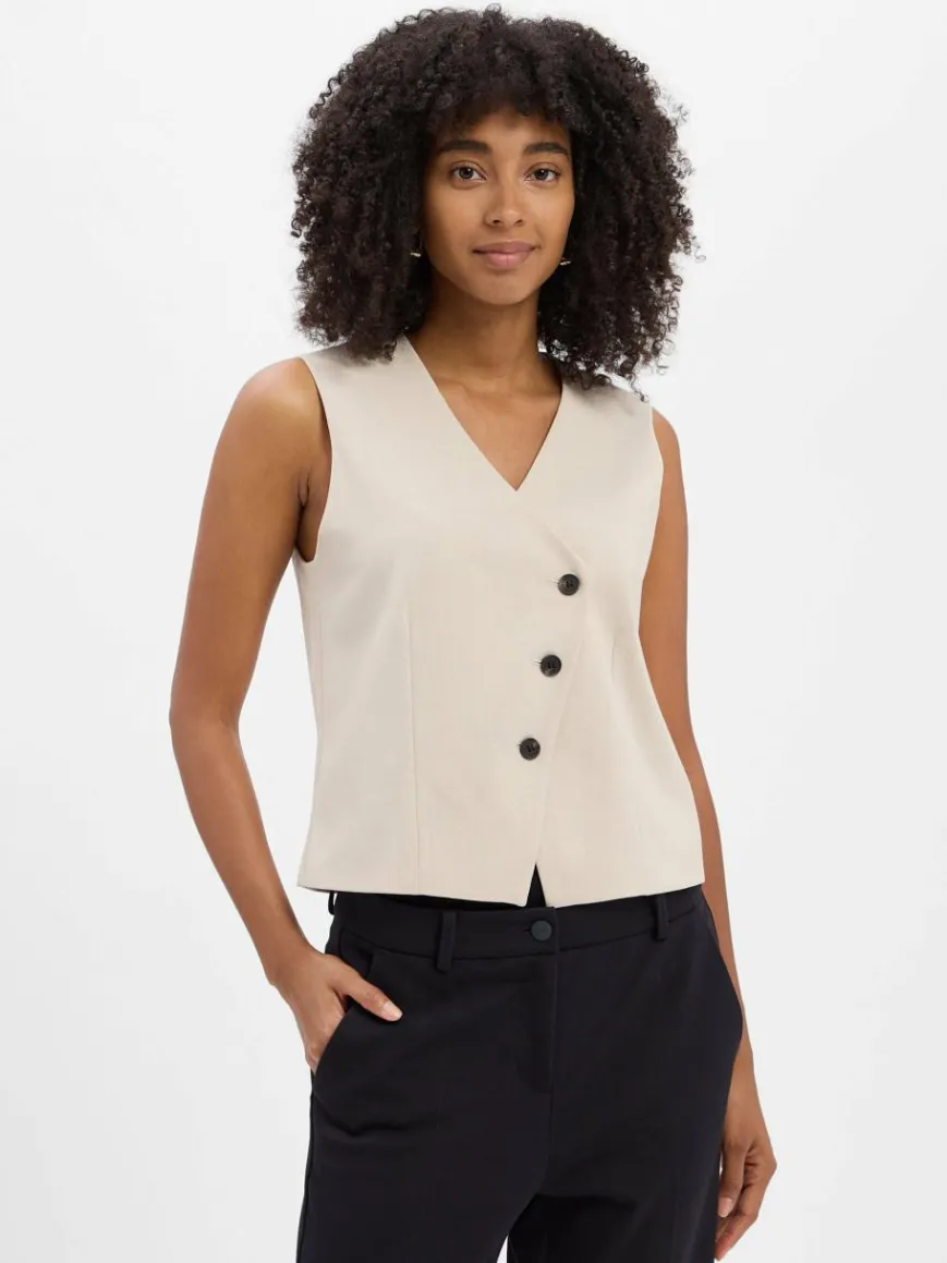 Die Anzugweste Warfa von Opus setzt sich mit ihrer asymmetrischen Knopfleiste trendig in Szene – eine schöne Ergänzung für elegante Office- und auch Denim-Looks.