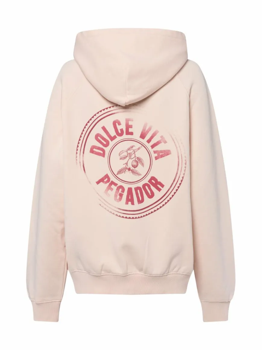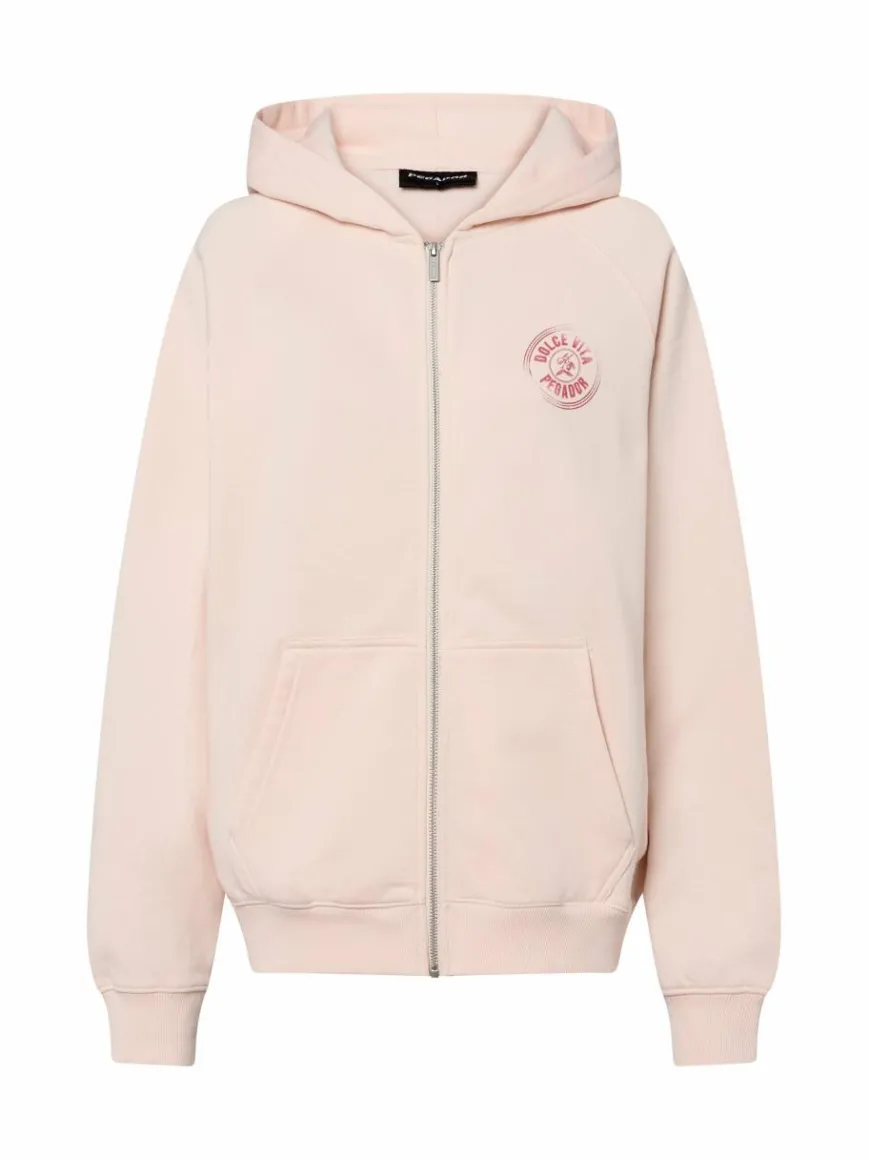 Die oversized Sweatjacke Nadia von PEGADOR punktet durch das komfortable Design mit inwendigem Soft Finish, ergänzt durch den Brust- und Backprint im Used-Look für extra Coolness.