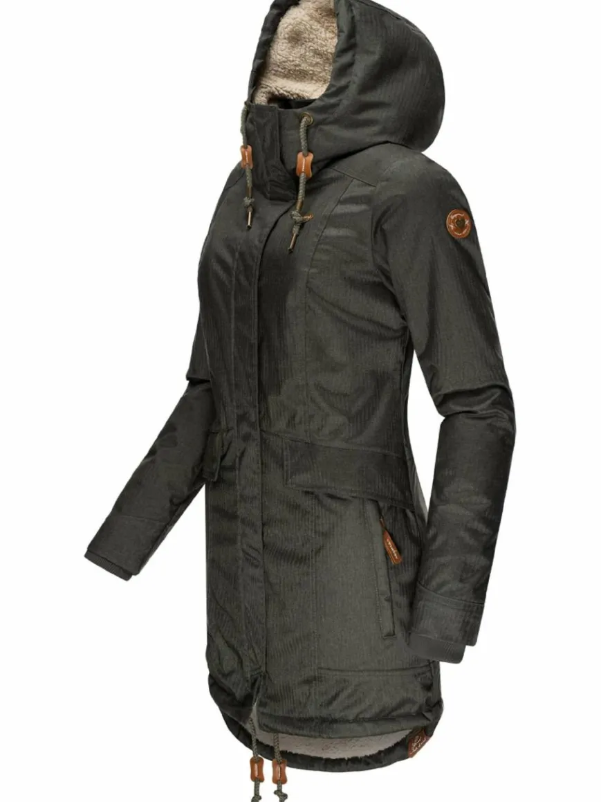 Angesagter, eleganter Damen Wintermantel mit großer Kapuze, weichem Teddyfell-Futter und dicken Tunnelzugkordeln von Ragwear.