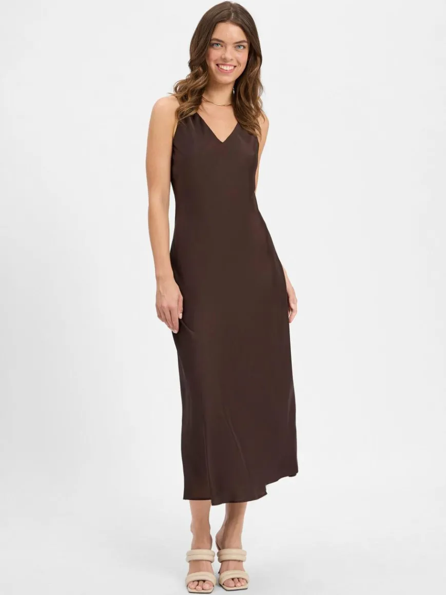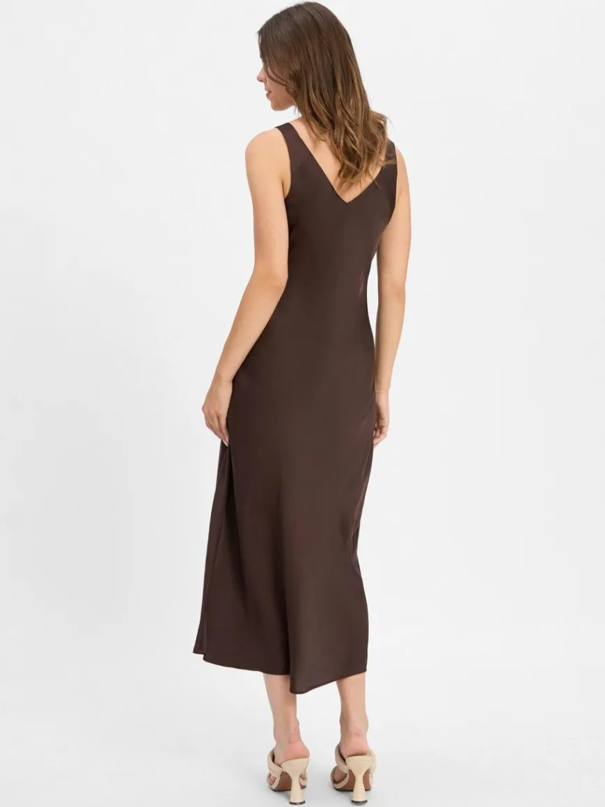 Satin-Kleid Qova pure mit schmalen Trägern, V-Ausschnitt und figurbetonter, taillierter Passform – die fließende Silhouette unterstreicht einen eleganten, femininen Look.