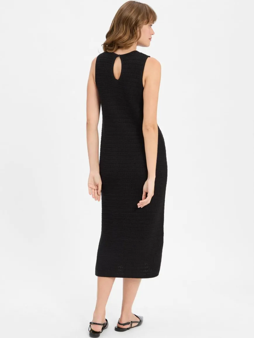 Eleganz trifft Komfort: das ärmellose Strickkleid Quila von Someday mit gerader Silhouette, praktischem Seitenschlitz und einem raffinierten Schlüssellochausschnitt mit Knopf auf der Rückseite.