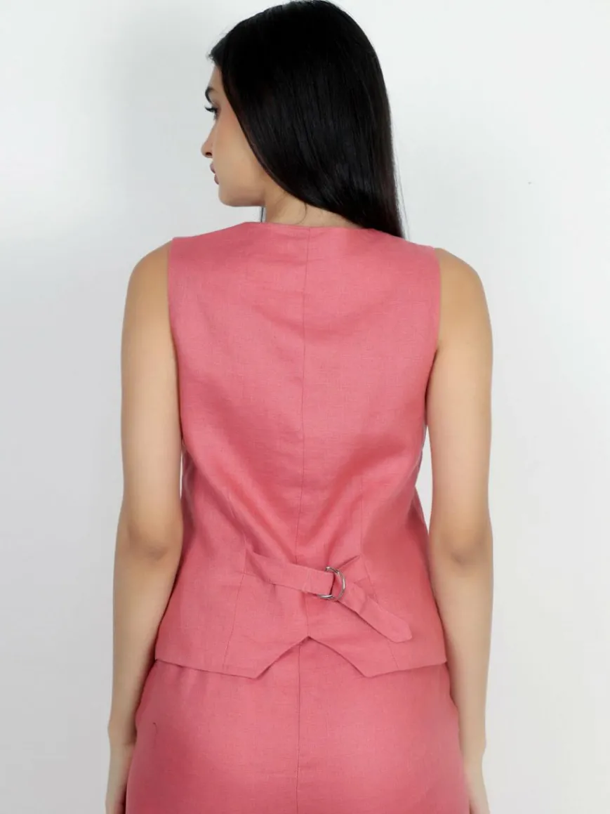 Diese klassische Blazerweste aus Leinen mit wunderschönen Details steht für feminine Eleganz. Leicht taillierter Schnitt, Leistentaschen vorn, Verstellbarer Riegel auf der Rückseite. Mit einem klar geschnittenen Stück können Sie in einer trendigen Bar einen selbstbewussten Auftritt hinlegen und auch im Büro Professionalität ausstrahlen.
