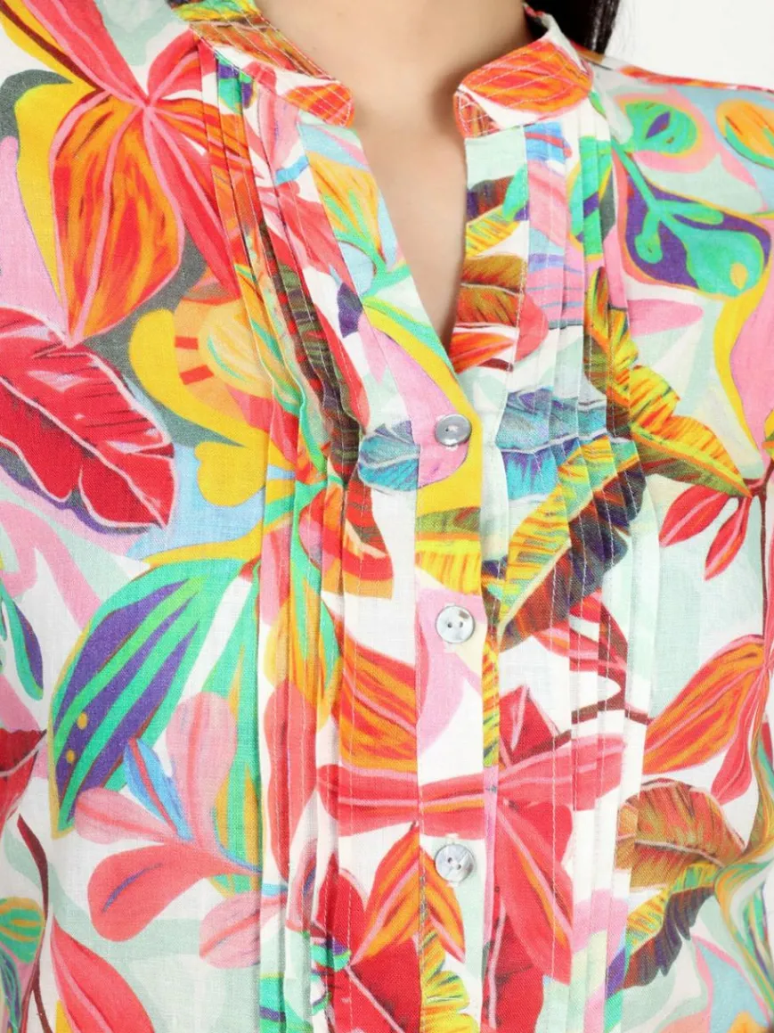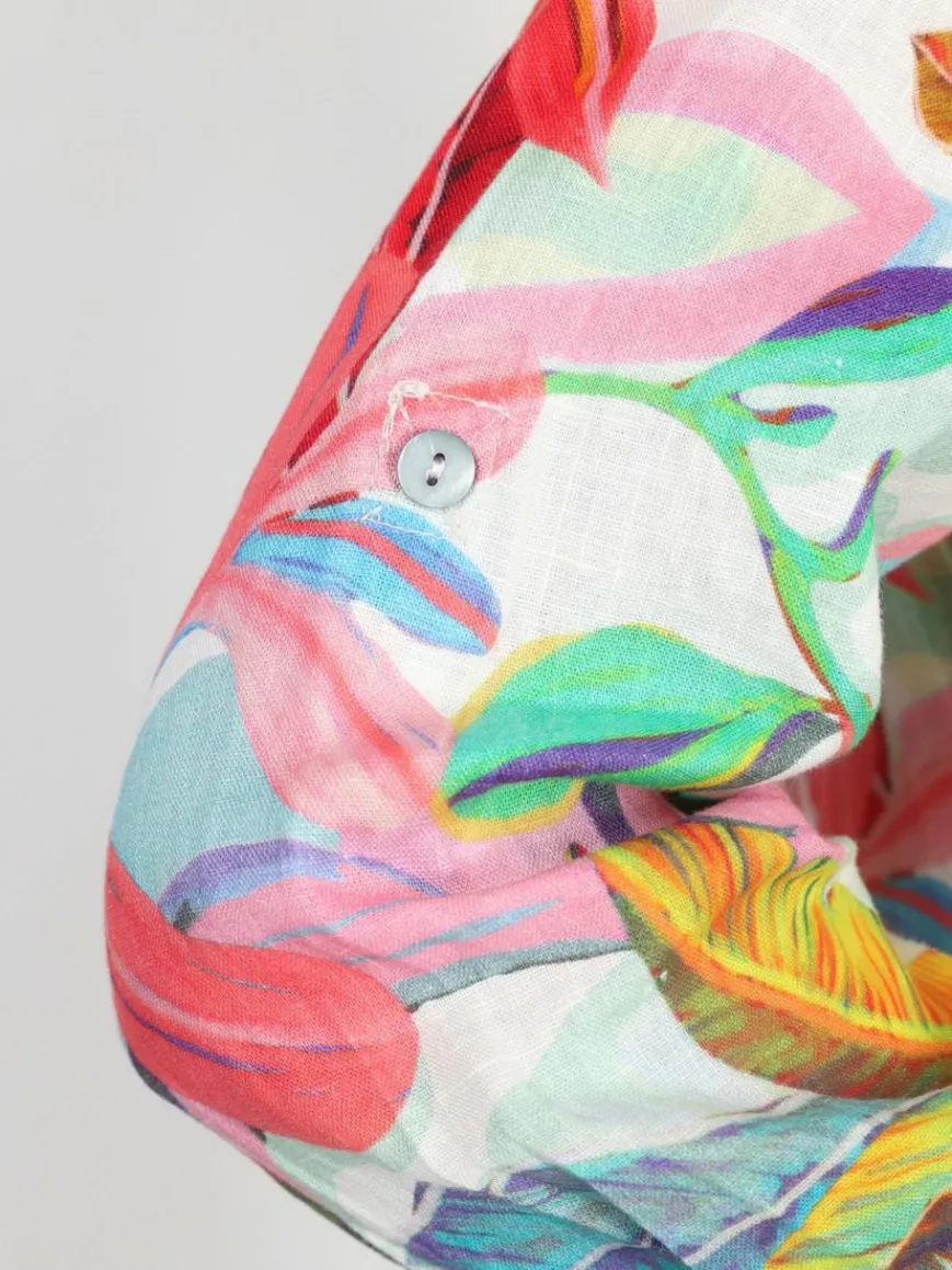 Kleid mit mehrfarbigem Blumendruck, 3/4-Rollärmeln und Biesen am Ausschnitt, die für ein feminines Finish sorgen. Diese lässige Kleid aus sommerlichem Leinen mit geschmackvollen Details macht schon beim Anziehen gute Laune.