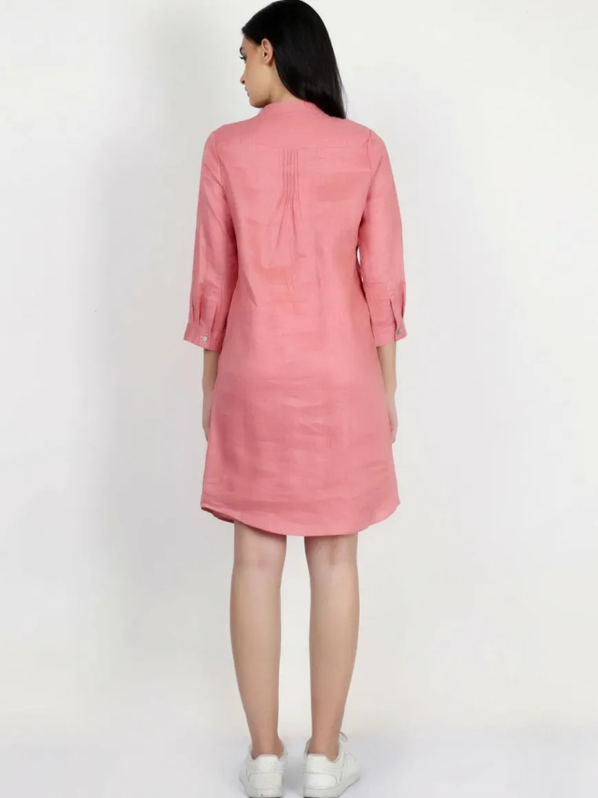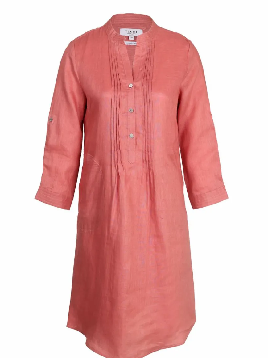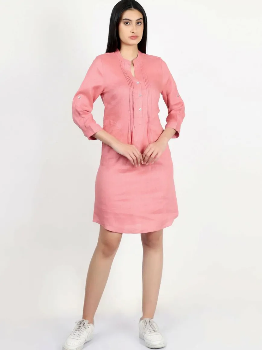 Ein lässiges Tunikakleid aus hochwertigem Leinen mit femininen Details. Das Kleid hat 3/4-Ärmel, die hochgekrempelt werden können, und Biesen vorne mit abgerundetem Saum. Kombinieren Sie das Kleid einfach mit Sneakers für einen lässigen Look oder Sandalen für einen formellen Look.